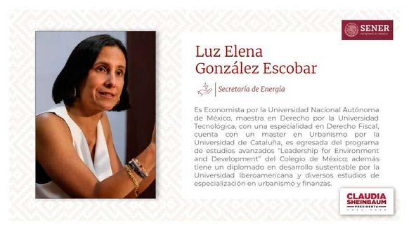 nLa presidente electa dio a conocer otra parte de su equipo de colaboradores en el que destaca la tabasqueña Luz Elena González Escobar, como titular de la Secretaría de Energían Jesús Antonio Esteva Medina, va a Comunicaciones, Transportes e Infraestructura; David Kershenobich a Salud; Raquel Buenrostro, a la Función Pública; y Edna Elena Vega Rangel, a Desarrollo Agrario, Territorial y Urbano