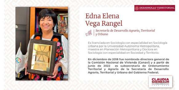 Edna Elena Vega También designada por Sheinbaum, es licenciada en Sociología con especialidad en Sociología Urbana por la Universidad Autónoma Metropolitana, maestra en Planeación Metropolitana y Doctora en Sociología con especialidad en