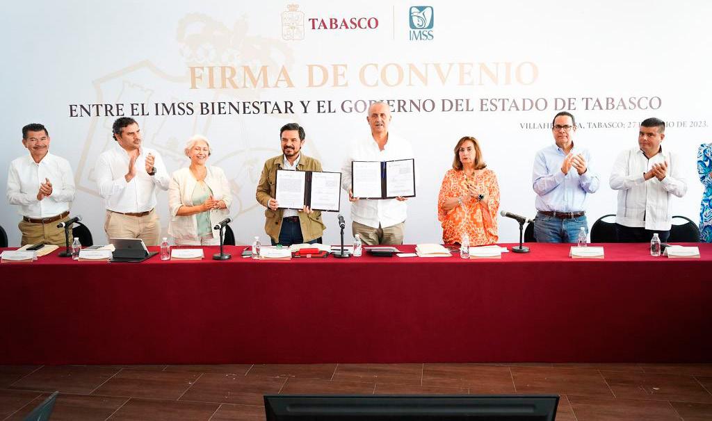 Vhsa. Tab., 27 de julio de 2023.- El gobernador Carlos Manuel Merino Campos y el director general del Instituto Mexicano del Seguro Social (IMSS), Zoé Robledo Aburto, suscribieron este jueves el Convenio de Coordinación que establece la forma de colaboración en materia de personal, infraestructura, equipamiento, medicamentos y demás insumos asociados para la prestación gratuita de servicios de salud, para personas sin seguridad social en Tabasco.