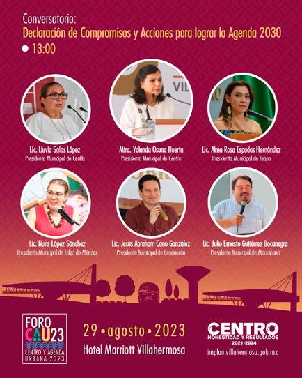 Además, se llevará a cabo el Panel Agenda Urbana en Movimiento; el Conversatorio: “Declaración de Compromisos y Acciones para lograr la Agenda 2030, encabezado por la presidenta municipal Yolanda Osuna Huerta, como anfitriona, y las alcaldesas Lluvia Salas López, de Centla; Nuris López Sánchez, de Jalpa de Méndez; Alma Rosa Espadas Hernández, de Teapa, y
