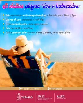 VHSA. TAB., 28 DE MARZO DE 2023.- Ante la llegada de las altas temperaturas que se están registrando en la entidad y la exposición prolongada al sol, la Secretaría de Salud de Tabasco invita a la población en general a tomar en cuenta las siguientes medidas ya que durante esta temporada aumentan los casos de deshidratación, golpes de calor, quemaduras en la piel y problemas gastrointestinales.
