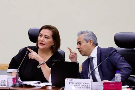 La consejera presidenta del INE, Guadalupe Taddei, y el secretario ejecutivo Miguel Ángel Patiño, durante una sesión extraordinaria del Consejo General
