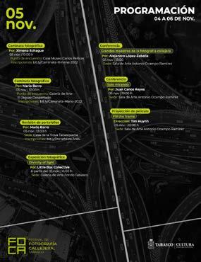 OCTUBRE DE 2022.- El Gobierno del Estado a través de la Secretaría de Cultura de Tabasco, reali zará del 4 al 6 de noviem bre la segunda edición del Festival de Fotografía Callejera (FOCA) 2022, en la que participarán reconocidos fotógrafos nacionales e internacio nales.