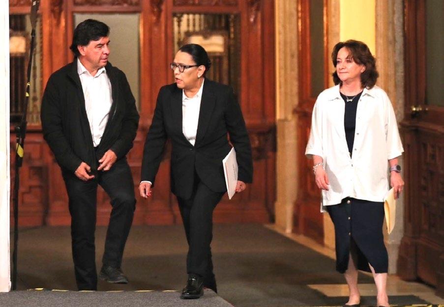 El titular de Comunicación Social de la Presidencia, Jesús Ramírez Cuevas, la titular de la Secretaría de Seguridad y Protección Ciudadana, Rosa Icela Rodríguez, y la fiscal de derechos humanos de la Fiscalía General de la República, Sara Irene Herrerías