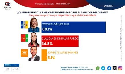 y que saquen más hechos, ciertos o no, contra Claudia [Sheinbaum] para [que la oposición] trate de remontar, ya que la diferencia en las encuestas es de más de 17 puntos [en favor de Sheinbaum sobre Gálvez]”, refiere. Por ejemplo, en la última encuesta realizada por Bloomberg a mediados de abril, Sheinbaum se llevó el primer lugar una intención de voto de 58,4%, mientras que Gálvez tuvo una preferencia de 32,9%.