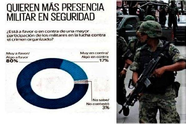 Regeneración, 30 de agosto de 2022. En una encuesta publicada por El Universal a cargo de Buendía y Márquez se revela que el 80% de los mexicanos quiere al Ejército en trabajos de seguridad.Yes que se trata de una encuesta sobre la percepción de la parti cipación de los militares de México en las tareas de seguridad.Cabe destacar que en días recientes el presidente AMLO pro puso que la Guardia Na cional sea comandada por la Defensa Nacional. Militares Los tionamientorespondieronencuestadosauncuesacercadela participación de la Fuer zas Armadas en el com bate contra el crimen organizado.Cabe destacar que la formulación de la pregunta-«¿Estafue: a favor o en contra de una mayor participación de los mi litares en la lucha contra el crimen organizado?» Así, un 51% señaló que se encontraba “muy a favor”, en tanto que un 29% mencionó que esta ban “algo a favor”. Así, los que se ma nifestaron en favor de la participación de los mi litares en tareas de se guridad suman 80%. Contra Por otra parte, un 10% de los encuestados señaló que estaba “muy en contra” y un 7% se ñaló que su opinión era “algo en contra”. Así, suma un 17% de encuestados que es tán en contra, en mayor o menor medida, de más partición de militares en tareas de seguridad. Reducir Por otra parte un 48% señaló que el tra bajo de López Obrador para reducir la violencia en México es bueno. Esto es, incre mentó dos puntos por centuales en compara ción al mismo ejercicio del mes de mayo. Zacatecas Y es que la en cuesta sobre la partici pación de los militares mexicanos en tareas de seguridad ser relacionan a violencia como la re ciente en -“YoZacatecas.voyestar por allá, voy la próxima semana, vamos a hacer incluso la reunión de se guridad, viernes 9, y voy a aprovechar porque voy a hacer una gira por la sierra, voy a visitar co munidades indígenas”. Lo anterior, infor mó este martes el pre sidente. Además AMLO explicó los motivos de los enfrentamientos en la entidad.