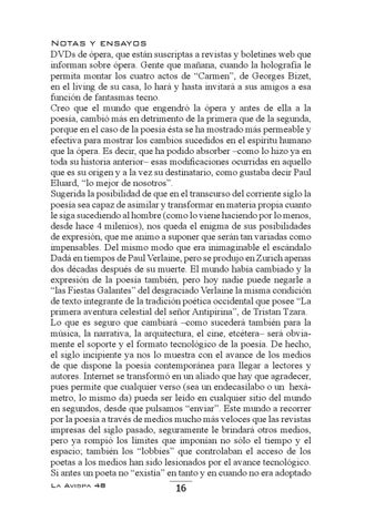 DVDs de ópera, que están suscriptas a revistas y boletines web que informan sobre ópera. Gente que mañana, cuando la holografía le permita montar los cuatro actos de “Carmen”, de Georges Bizet, en el living de su casa, lo hará y hasta invitará a sus amigos a esa función de fantasmas tecno. Creo que el mundo que engendró la ópera y antes de ella a la poesía, cambió más en detrimento de la primera que de la segunda, porque en el caso de la poesía ésta se ha mostrado más permeable y efectiva para mostrar los cambios sucedidos en el espíritu humano que la ópera. Es decir, que ha podido absorber –como lo hizo ya en toda su historia anterior– esas modificaciones ocurridas en aquello que es su origen y a la vez su destinatario, como gustaba decir Paul Eluard, “lo mejor de nosotros”. Sugerida la posibilidad de que en el transcurso del corriente siglo la poesía sea capaz de asimilar y transformar en materia propia cuanto le siga sucediendo al hombre (como lo viene haciendo por lo menos, desde hace 4 milenios), nos queda el enigma de sus posibilidades de expresión, que me animo a suponer que serán tan variadas como impensables. Del mismo modo que era inimaginable el escándalo Dadá en tiempos de Paul Verlaine, pero se produjo en Zurich apenas dos décadas después de su muerte. El mundo había cambiado y la expresión de la poesía también, pero hoy nadie puede negarle a “las Fiestas Galantes” del desgraciado Verlaine la misma condición de texto integrante de la tradición poética occidental que posee “La primera aventura celestial del señor Antipirina”, de Tristan Tzara. Lo que es seguro que cambiará –como sucederá también para la música, la narrativa, la arquitectura, el cine, etcétera– será obviamente el soporte y el formato tecnológico de la poesía. De hecho, el siglo incipiente ya nos lo muestra con el avance de los medios de que dispone la poesía contemporánea para llegar a lectores y autores. Internet se transformó en un aliado que hay que agradecer, pues permite que cualquier verso (sea un endecasílabo o un hexámetro, lo mismo da) pueda ser leído en cualquier sitio del mundo en segundos, desde que pulsamos “enviar”. Este mundo a recorrer por la poesía a través de medios mucho más veloces que las revistas impresas del siglo pasado, seguramente le brindará otros medios, pero ya rompió los límites que imponían no sólo el tiempo y el espacio; también los “lobbies” que controlaban el acceso de los poetas a los medios han sido lesionados por el avance tecnológico. Si antes un poeta no “existía” en tanto y en cuando no era adoptado La Avispa 48