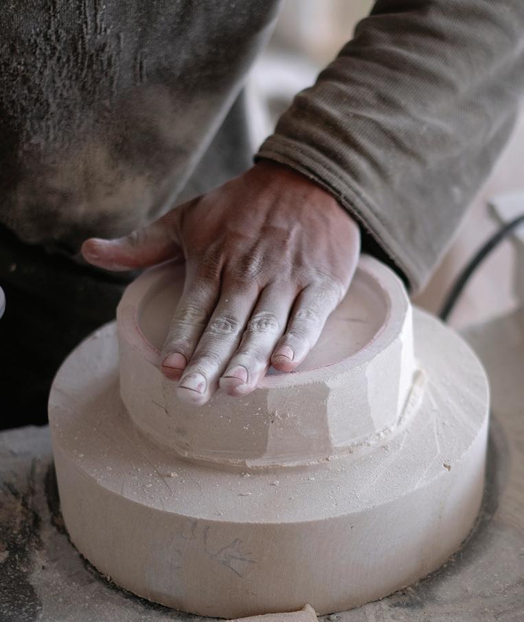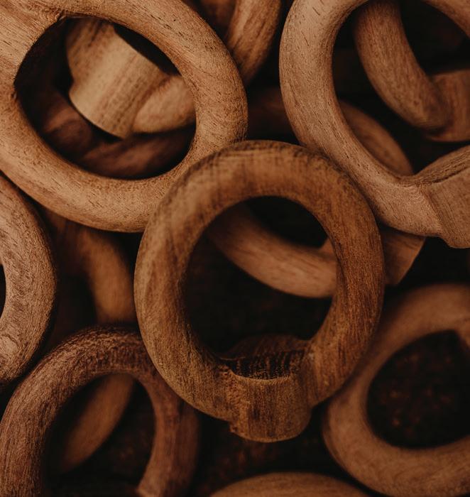 from natural causes or been felled for construction purposes. The rescued and salvaged roots, trunks and branches are brought to Kirah’s Master Workshop in Santa Cruz, where they are carefully sorted, air-dried and stored. The process of giving shape to the raw material then starts by identifying the potential of each piece with a team of Master Artisans, playing off the natural shapes, patterns and characteristics of the wood.