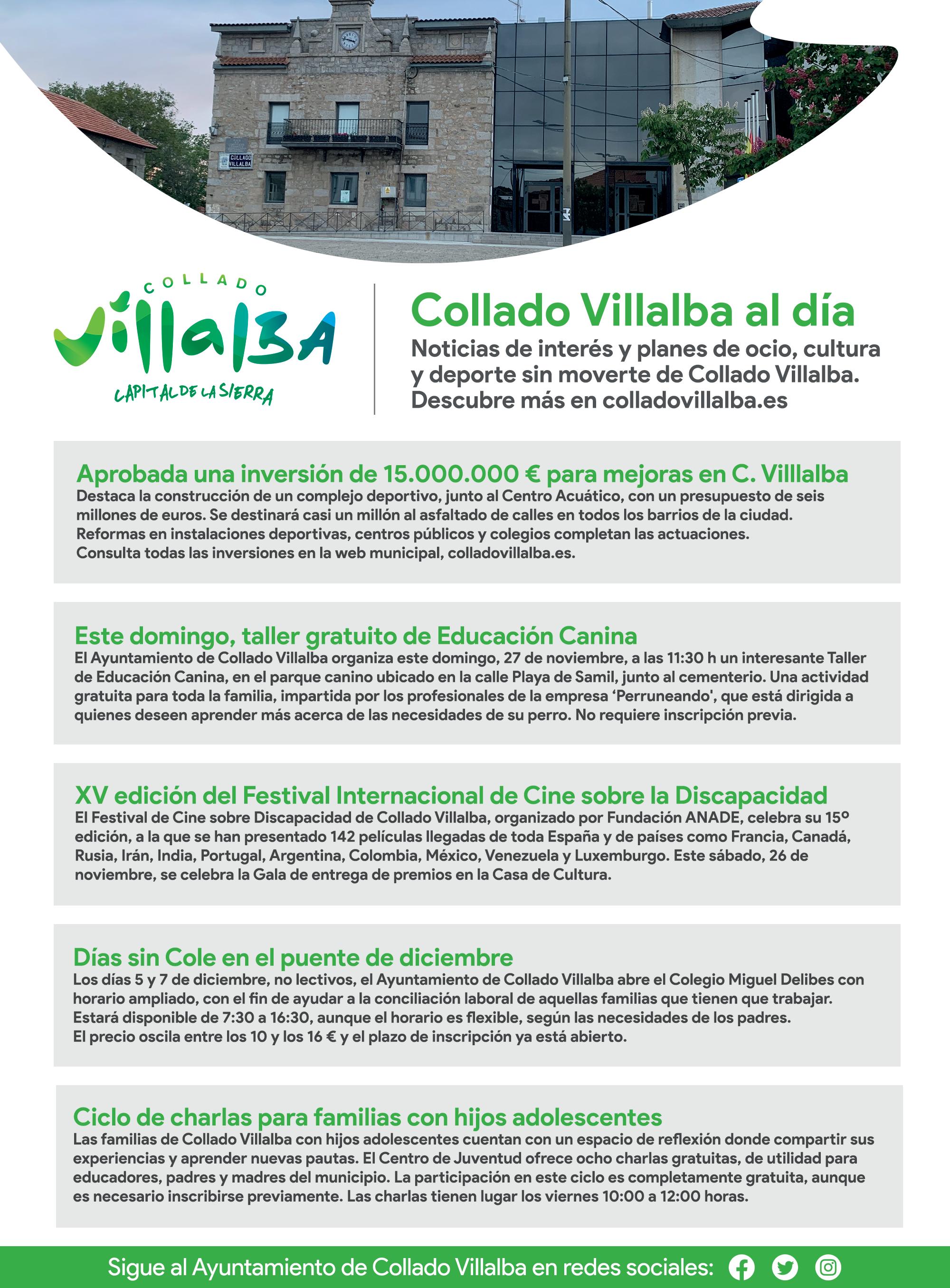 El Ayuntamiento de Collado Villalba organiza este domin go, 27 de noviembre, a las 11:30 un Taller de Educación Cani na, en el parque canino de la