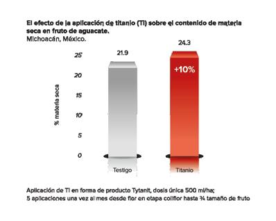 Aplicación foliar de titanio en la etapa de brotación y floración aumenta viabilidad, capacidad de germinación de polen y adhesión de polen al estigma, mejorando la polinización y cuajado. En el cultivo de aguacate aplicaciones foliares de titanio en forma disponible para las plantas durante el desarrollo de fruto mejoran calidad del fruto, incrementando contenido de calcio, potasio, ma-