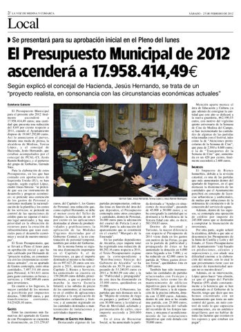 El Presupuesto Municipal para el presente año 2012 finalmente ascenderá a 17.958.414,49 euros; una cantidad que presenta una reducción del 8,69 por ciento respecto a 2011, cuando el Ayuntamiento dispuso de 19.667.292,80 euros. Así lo anunciaron el jueves, durante una rueda de prensa, la alcaldesa de Medina, Teresa López, y el concejal de Hacienda, Jesús Hernando, que estaban acompañados por el concejal de PCAL-CI, Jesús Ramón Rodríguez, y el portavoz del grupo de Gobierno, Germán Sáez. Para la elaboración de estos Presupuestos, en los que han contado con aportaciones de Izquierda Unida (IU), se han seguido, según explicó López, cuatro líneas básicas: “se pretende que sea ese instrumento de desarrollo y progreso económico; se pretende una contención de los gastos de Personal y corrientes mediante la racionalización de la plantilla y los costes de los servicios; se pretende un control de las operaciones de crédito para no superar el máximo legal autorizado; y hay una prioridad en la obtención de recursos para la creación de infraestructuras que sean esenciales para el desarrollo económico y social de nuestro municipio”. El Texto Presupuestario, que se llevará a Pleno el lunes para su aprobación inicial y que ha sido calificado por Hernando de “proyecto realista, en consonancia con las circunstancias económicas actuales”, en su apartado de Gastos contempla, entre otras cantidades, 7.497.311,64 euros para Personal; 4.741.611 euros para gasto corrientes en bienes y servicios; y 1.942.699,48 euros para inversiones. En cuanto a los Ingresos, la mayor cantidad de los mismos se percibirán por impuestos directos, 7.060.000 euros, y por transferencias corrientes, 5.625.620,10 euros.