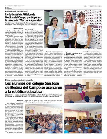 lismo de los ejes, entre otros. Como en la campaña anterior, dependiendo del problema que se detecte, o bien se trata en la tienda o bien se pide cita en el oftalmólogo para que le atienda. De la Vega aseguró que utilizan “nuestro trabajo, nuestras ganas y nuestro saber hacer para ayudar a una sociedad que está desatendida a nivel visual”. El proyecto lo organiza la Fundación Alain y está destinada a niños con edades comprendidas entre los 5 y los 7 años. La campaña finaliza el 16 de octubre.
