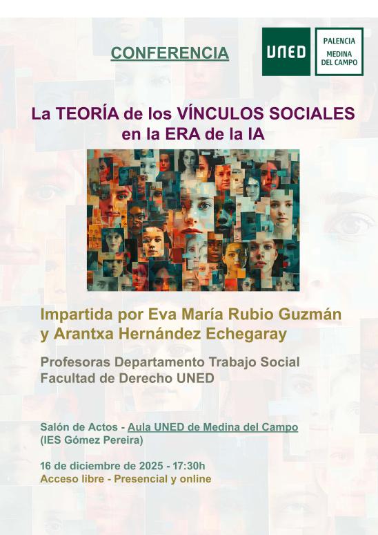profesoras del Departamento de Trabajo Social de la Facultad de Derecho de la UNED, quienes analizarán los retos y oportunidades que plantea el uso creciente de la IA para la construcción, mantenimiento y transformación de los vínculos sociales en distintos ámbitos de la vida cotidiana. El acto, organizado por la UNED en Palencia – Aula de Medina del Campo, contará con acceso libre y podrá seguirse tanto de manera presencial como online, facilitando así la participación de todas las personas interesadas en una temática de plena actualidad.