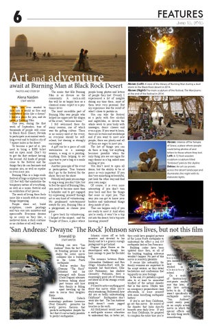 The music that fills Burning Man is as diverse as the community. A rock-n-roll fan will be as happy here as a classical music expert or a psytrance lover. The most incredible part of Burning Man was people who helped me appreciate the slogan of the event, “welcome home.” I felt welcomed there for many reasons, one of which was the gifting culture. There is no money used at the event, so everyone should be selfreliant, but sharing is strongly encouraged. A gift can be a piece of cold watermelon or a massage session, a song or a painting. Anything from helping to set up a tent to just a hug or a smile counts too. Another principle of the event is participation. True burners don’t go to the festival for the show, they are the show. Nobody will push you on stage to sing a song you don’t like, but to feel the spirit of Burning Man, you need to become more than a beholder and to get engaged by expressing yourself through art or any kind of volunteering. No preplanned entertainment awaits for you; Burning Man is a playground, so choose your game. I gave back by volunteering. I helped at the airport, and the Temple of Grace, a place where