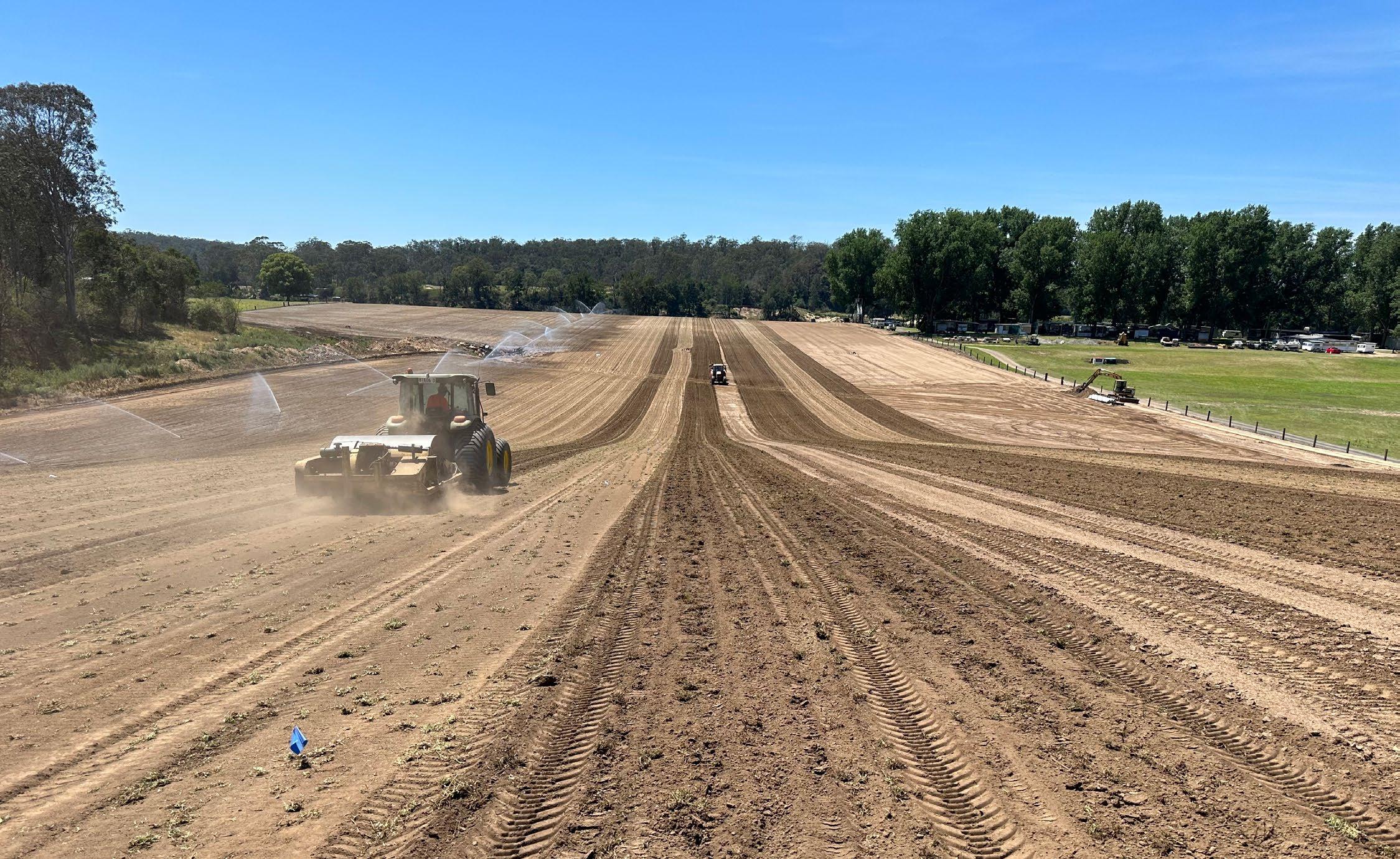 Woodburn Oval, causing undulations, cracks and compaction issues that significantly compromised its usability. Consequently, there was a need for levelling to address these unsafe undulations and resurfacing to rectify surface imperfections, invasive weeds, and grasses to create a uniform surface. This restoration process involved the decompaction and working over of the soil profile, topdressing, slight levelling/shaping of the playing surface and laying new turf.