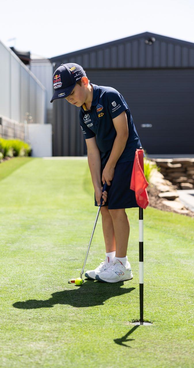 with Sir Grange Zoysia, are not just for show. “We’ve got tables and chairs out on it, and it handles a lot of weekend wear and tear, including kids playing and jumping castles. It’s cut at 50mm, making it durable and perfect for heavy use.”