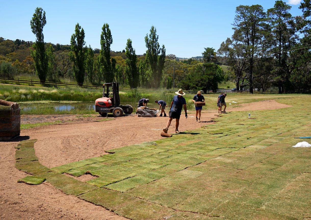 4mm at each cycle, bearing in mind it was 37- 44 degrees in February with strong hot easterly winds at the base of the escarpment where the school was situated. On Saturday morning, low-level shutoffs were found in the system and the tank was nearly dry as there was no recharge into the tank. We found a gate valve that was shut and opened it and heard water going into the tank but then realised this was scheme water, not from the bore. We had no access to the bore resets, so we let the scheme run. We shut the irrigation control system down until that evening and then set it to run again on Sunday. On Monday, we managed to get Western Irrigation in as they manage the irrigation for this site and the issue was an iron filter. Once this was rectified the bore kicked in and recharge began. We were set to start laying that week; however, Lawn Doctor did not make the final decision to install until we were convinced the water was available.