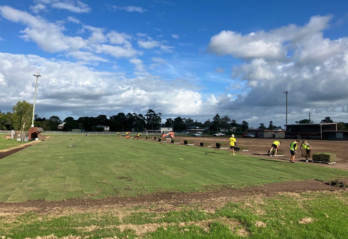 The remediation of Queen Elizabeth Park commenced with a request from the council for the flood-affected grass areas to be also repaired through the installation of TifTuf. Clarence Valley staff administered pre-emergent herbicides and controlledrelease fertilisers before sprigging TifTuf across an 8,500m2 area, followed by rolling and watering the park upon completion of the project.