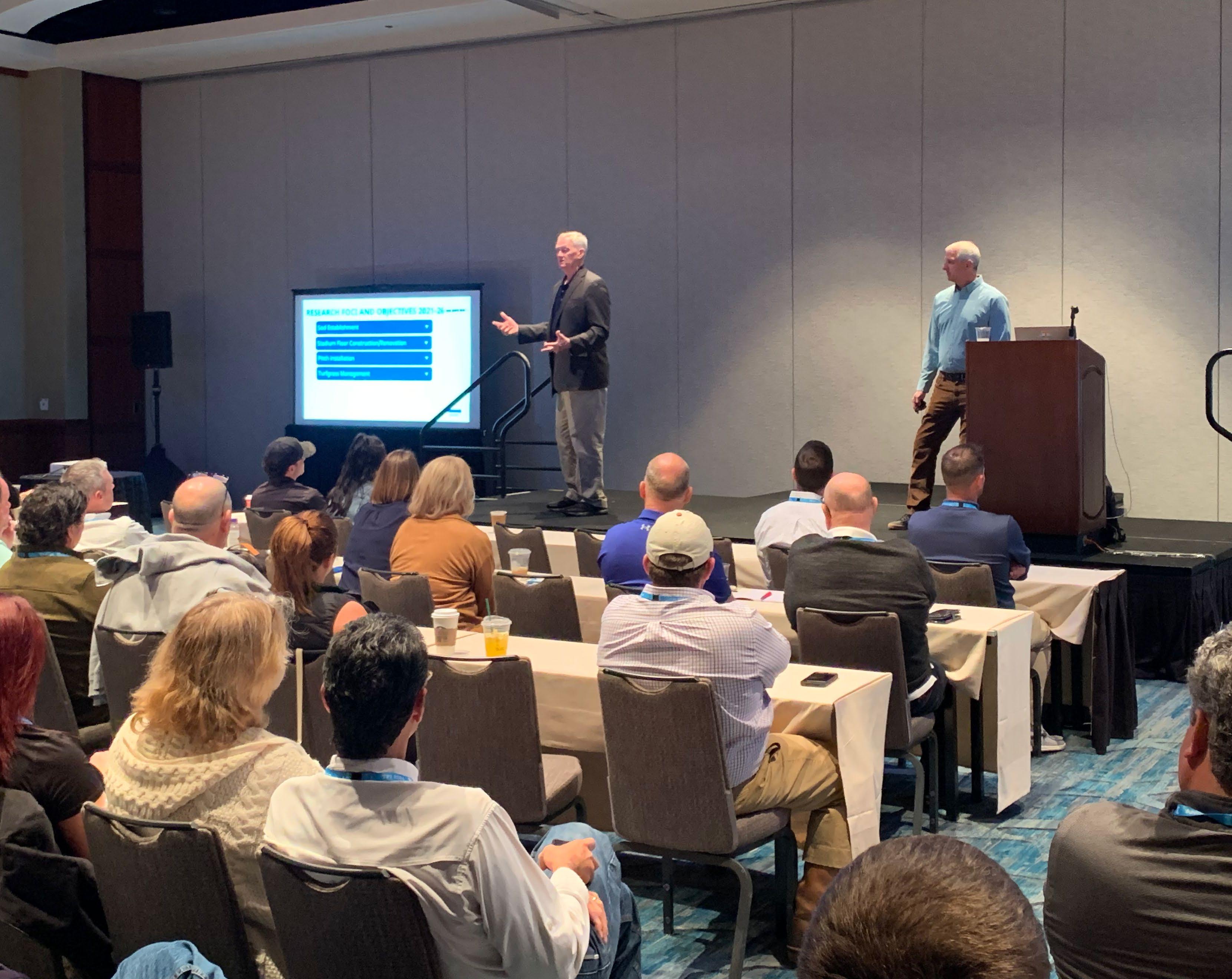 Simon Adermann spoke about the increase in demand for sports turf playing surfaces and the results of the latest STRI research data. Daryl Sellar spoke on best practice turf management and shared information from the Kangaroo Island turf trials and the