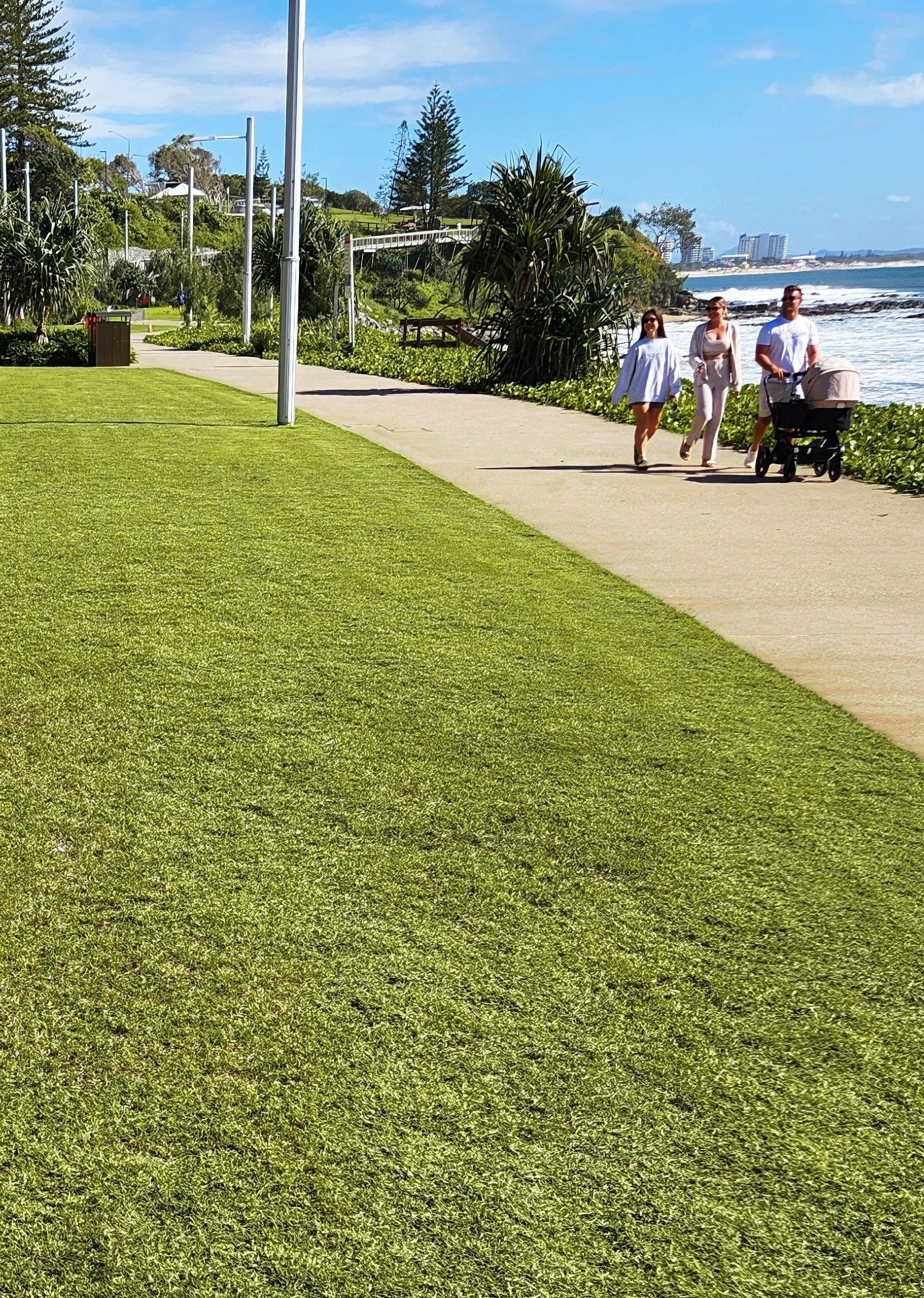 improved variety that would suit all the needs the council required for such an area. TifTuf Hybrid Bermuda was the chosen turf variety based on its wear tolerance and that it would handle the punishment of sporting events such as the Mooloolaba Triathlon, the Sunshine Coast Marathon and other fun runs whereby the grassed area can be covered for up to 10 days at a time with temporary infrastructure that is used for these events.