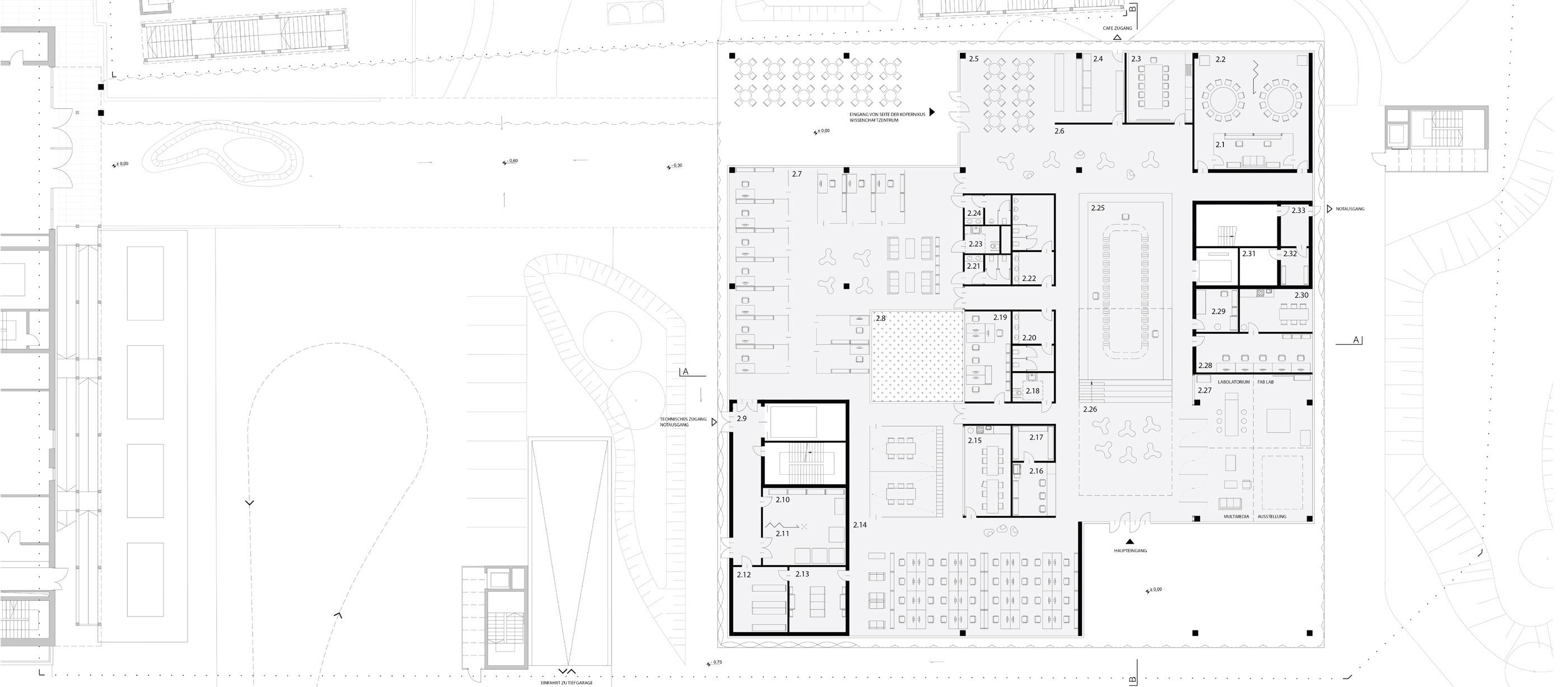 AS PART OF A PROCESS OPTIMIZATION, THE STRUCTURE FOUNDED IN 1894 AND LATER ADDITIONS WERE SUPPLEMENTED WITH EAST AND WEST EXTENSIONS, CREATING BOTH A SPATIAL AND FUNCTIONAL CLOSED LOOP. FOR ENERGY-EFFICIENCY AND AESTHETIC REASONS, IT IS ESSENTIAL TO MOVE AWAY FROM THE PRACTICE OF PIECEMEAL ADDITIONS AND INSTEAD CONCEIVE THE BUILDING AS A COHESIVE UNIT. THE RESULTING INTERIOR COURTYARDS PROVIDE BOTH LIGHT-FILLED THERAPY AND TREATMENT SPACES AS WELL AS PROTECTED INTERNAL OUTDOOR AREAS. IN ADDITION TO THE NEWLY BUILT THERAPY AREAS IN THE SOUTH, THERE IS AN ADDITIONAL SUNKEN TERRACE WITH SHADING OPTIONS AND THERAPY GARDENS FOR PATIENTS (FEATURING SENSORY ELEMENTS, HERBS, FLOWERS, BERRIES), WHICH ALSO GRANTS ACCESS TO A LOWER TERRACE WITH RAISED PLANTING BEDS.