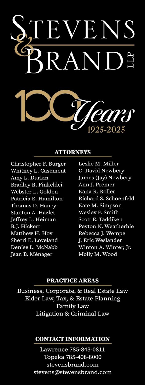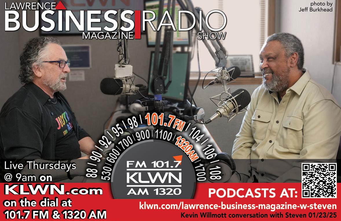 © 2025 Lawrence Business Magazine, LLC Lawrence Business Magazine, is published quarterly by Lawrence Business Magazine, LLC and is distributed by direct mail to businesses in the Lawrence & Douglas County Community. It is also distributed at key retail locations throughout the area and mailed to individual subscribers. All rights reserved. No part of this publication can be reprinted or reproduced without the publisher’s permission. Lawrence Business Magazine, LLC assumes no responsibility for unsolicited materials. Statements and opinions printed in the Lawrence Business Magazine are the those of the author or advertiser and are not necessarily the opinion of Lawrence Business Magazine.