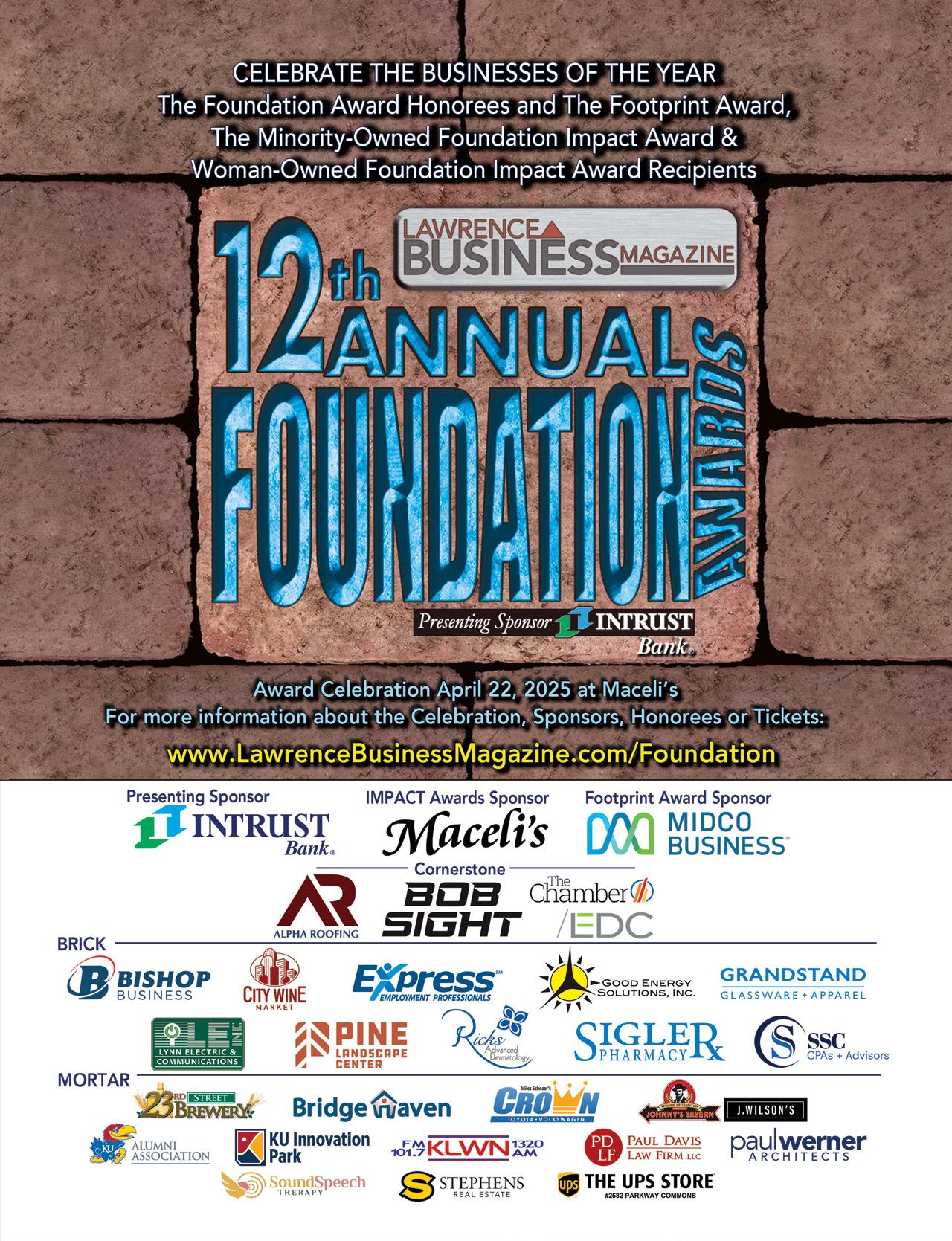 The 12 Annual Lawrence Business Magazine Foundation Awards with presenting sponsor INTRUST Bank will take place on April 22 at Maceli’s. We hope you can come out and help us celebrate these growing businesses and businesses giving back. More info at LawrenceBusinessMagazine.com/foundation