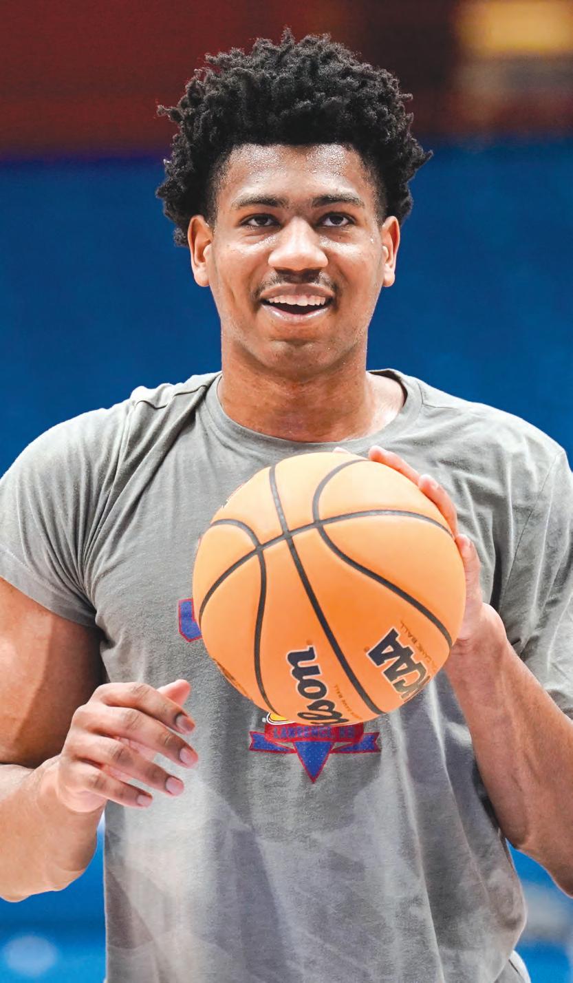 Last season: Still dealing with a nagging ankle injury suffered during the spring of 2024, Tiller decided to enroll early last winter and join the Jayhawks for the second half of the 2024-25 season. The idea was that he would use his redshirt season, get acclimated to KU’s scheme and culture and, once healthy, develop by practicing against veterans like KJ Adams and Hunter Dickinson and young upstarts like Flory Bidunga. However, Tiller instead had to undergo surgery and was using a mobility scooter at the end of the season. This season: He returned to action at the start of July, with Self calling him “100%” and praising his skill but noting that his timing was off (like Elmarko Jackson’s) and he would take some time to improve athletically. How quickly Tiller reattains his pre-injury form will clearly dictate how much of a role he can occupy on this year’s team. The Jayhawks don’t have a lot of true powerforward types on the roster, but with his size and length (including a 7-foot-3 wingspan) combined with a bit more face-up game than KU’s other post players, he could make for an intriguing complement in twobig lineups with Bidunga or Paul Mbiya. Self has said he also envisions Tiller playing center at times like Adams did during his own career with the Jayhawks. That role, though, seems less necessary in the short term after the midsummer signing of Mbiya.