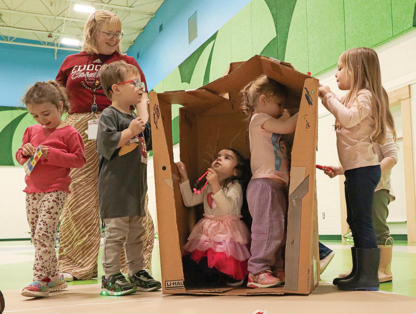 while others emphasize fine motor skills and design ideation. In December, students explored physics and color mixing by rolling paint-covered cars down a paper-covered table. January’s theme centered around the letter ‘B,’ where students built structures using recyclable materials, beaded bracelets, and decorated big boxes with vibrant colors and designs.