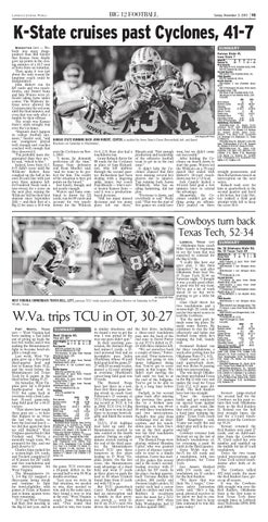 in similar situations, and we found a way to get the win. I was proud of the way our guys didn’t quit.” In their overtime possession, the Horned Frogs had minus-5 yards, a 15yard personal foul and an incomplete pass. Jaden Oberkrom, whose 45-yard field goal tied the game 2727 with 19 seconds to play, missed a 62-yard attempt in overtime. Oberkrom’s career-long field goal was 53 yards. The Horned Frogs have lost three in a row, their first three-game losing streak in coach Gary Patterson’s 13 seasons at TCU. Patterson’s only losing record at TCU is 5-6 in 2004. TCU (3-6, 1-5 Big 12) will have to win its last three to become bowl-eligible and finish the season at .500. TCU’s 17-10 halftime lead held up until the Mountaineers started to take control in the fourth quarter. During an eightminute stretch starting at the end of the third quarter, the Mountaineers forced TCU into three turnovers in five plays leading to 17 West Virginia points. On the last score, the Mountaineers took advantage of a short field and went 17 yards in three plays to push the lead to 10 when Trickett found Sims from 13 yards out with 7:11 to go. But TCU quarterback Casey Pachall — who had an interception and a fumble in that previous stretch — went 12for-15 on TCU’s next two drives. He went 8-for-9 on
