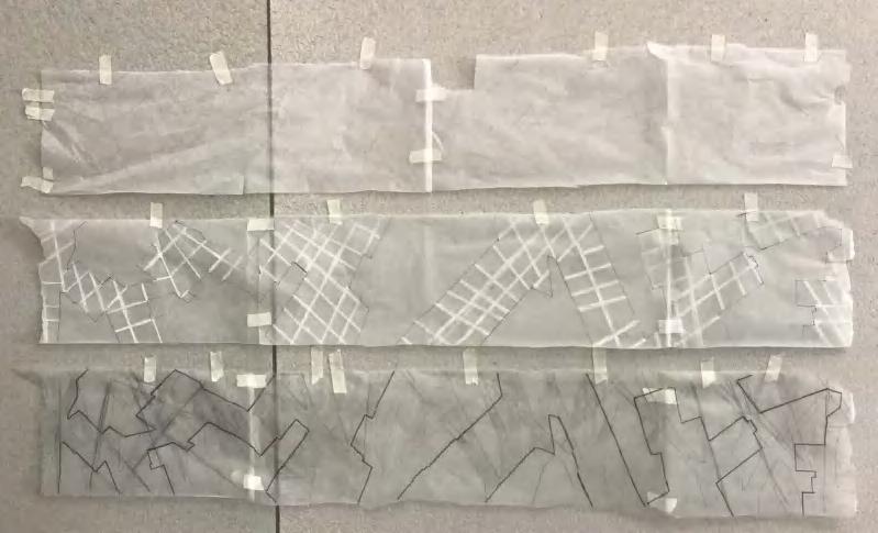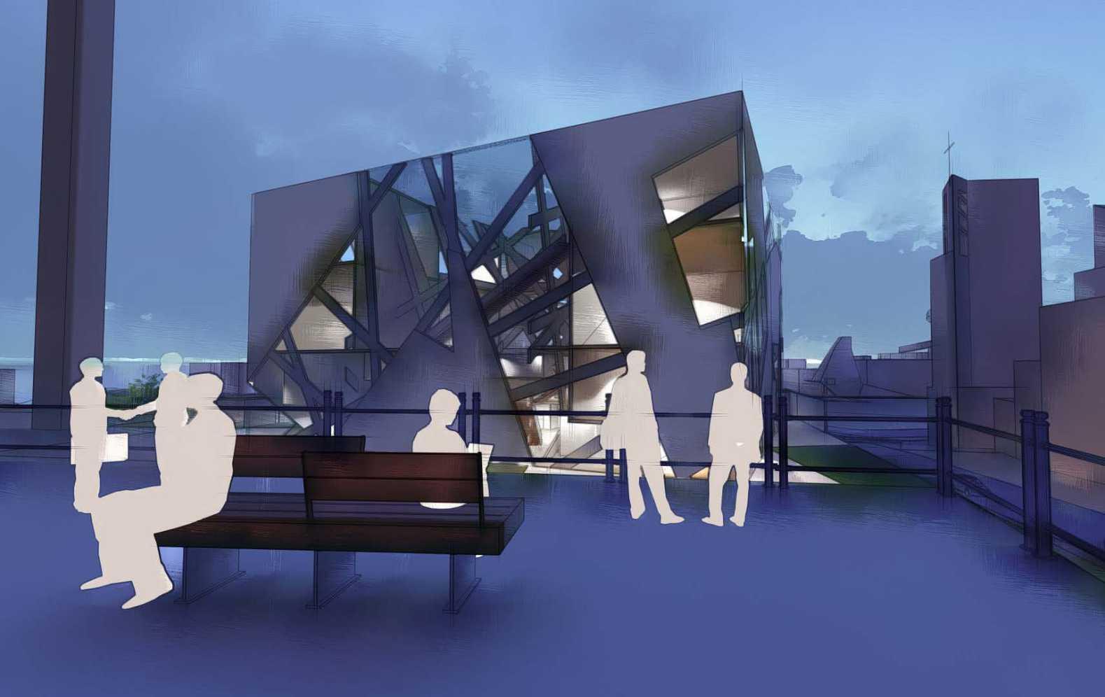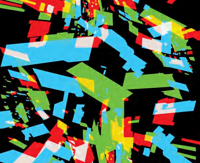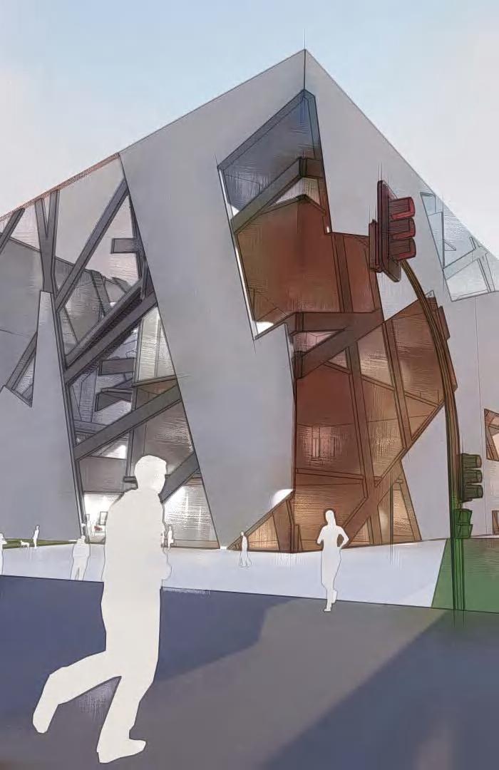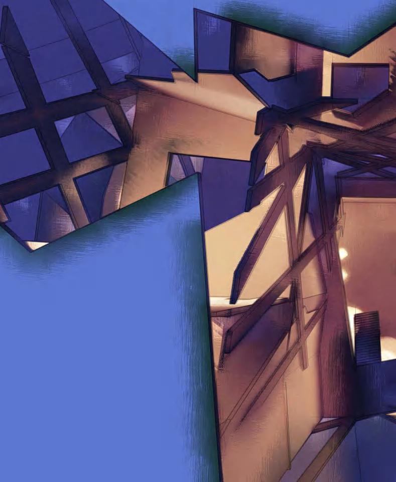 The main composition of the clip art is a model of downtown Los Angeles folded in an equilateral triangle. The idea in the picture comes from the classic fragment of the mirror-folded Paris city in the movie “Inception”. The different colors in the painting represent different buildings, reflecting the high density of buildings in the city and the crowded streets. In the conception stage, we hope that the basic structure of the artwork can be reflected in the exterior of the project building.