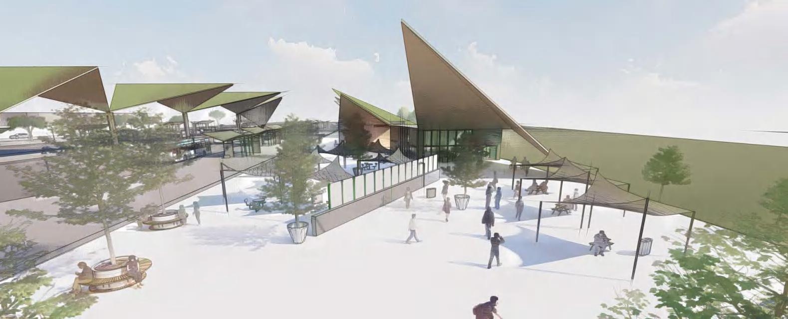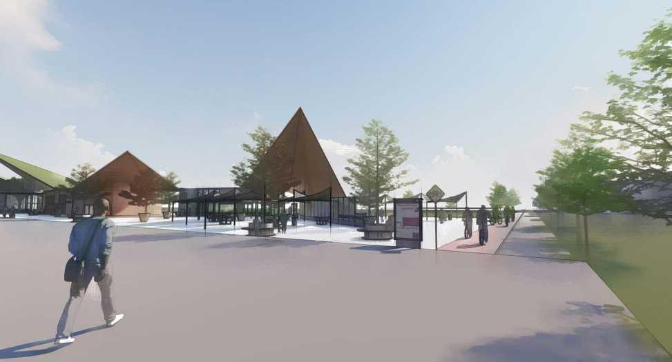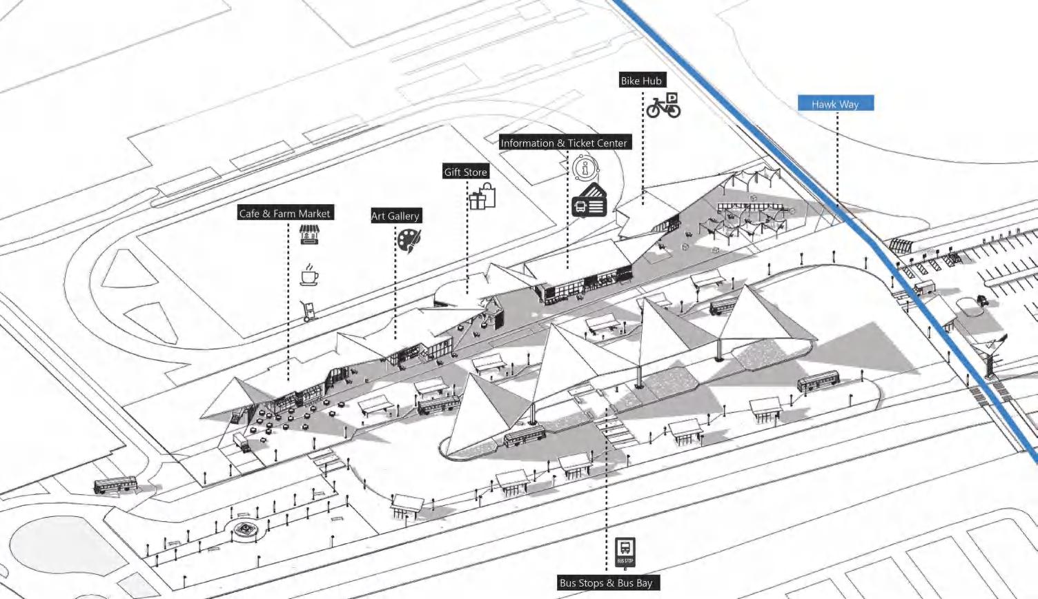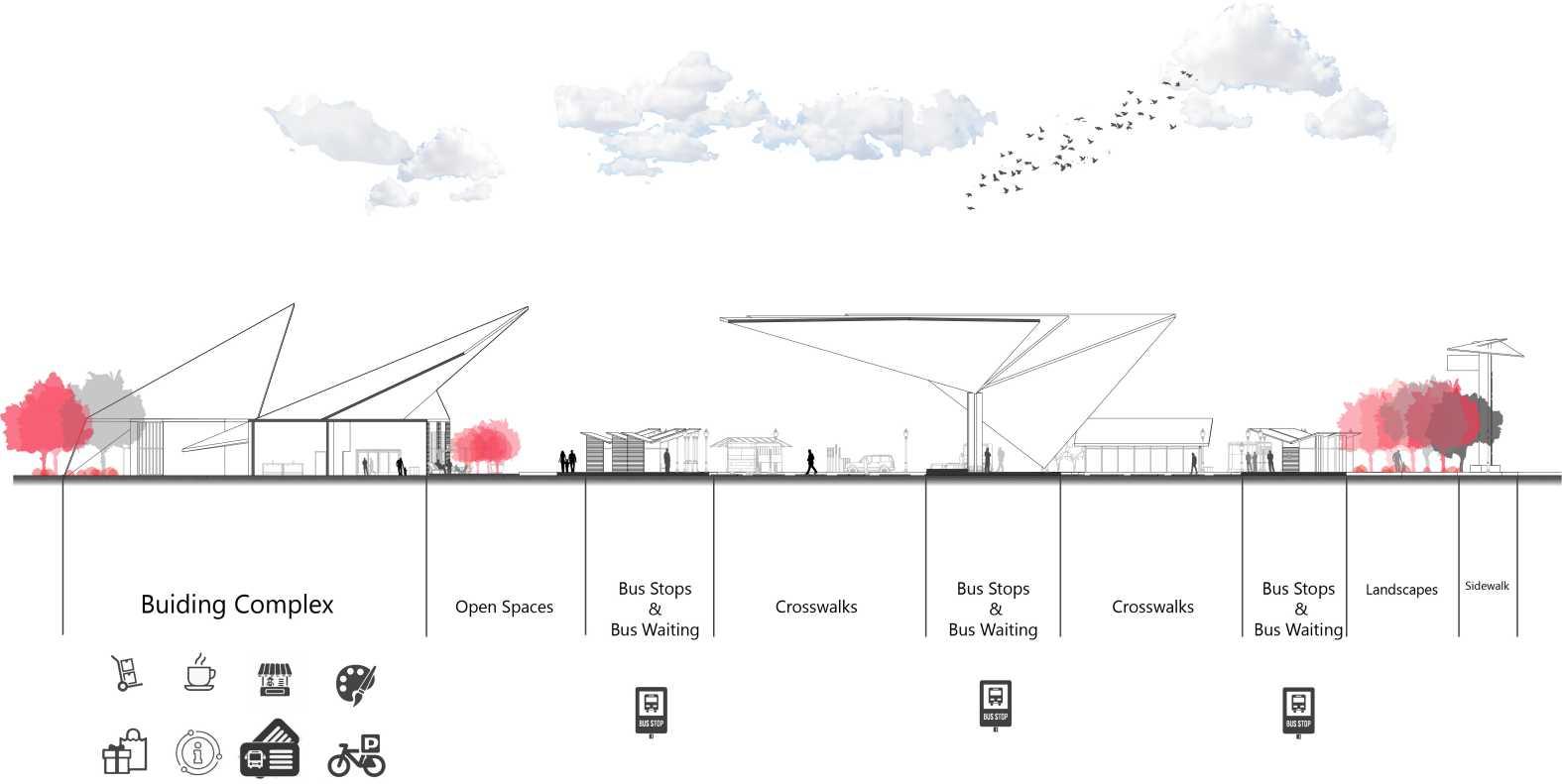 The northern building complex on the campus side has the most important functions and facilities. The consultation center and waiting room of the station provide passengers with traffic information and consultation. A series of commercial areas such as shops, cultural exhibition rooms, agricultural supermarkets, coffee shops, etc. provide fast and convenient life for people passing by the station. The Hawk way that passes through the station is a mixed bicycle and sidewalk that links the station to the main campus.