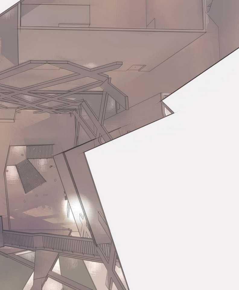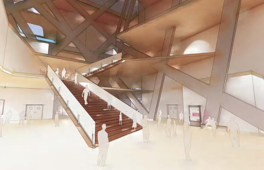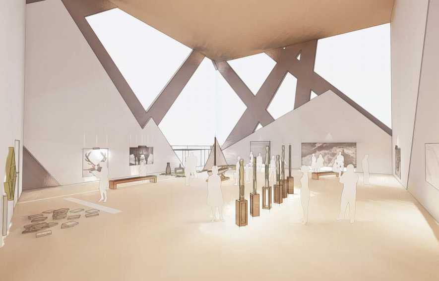 A bird’s eye view of the museum hall from above, the internal supporting structure and the layout of each floor