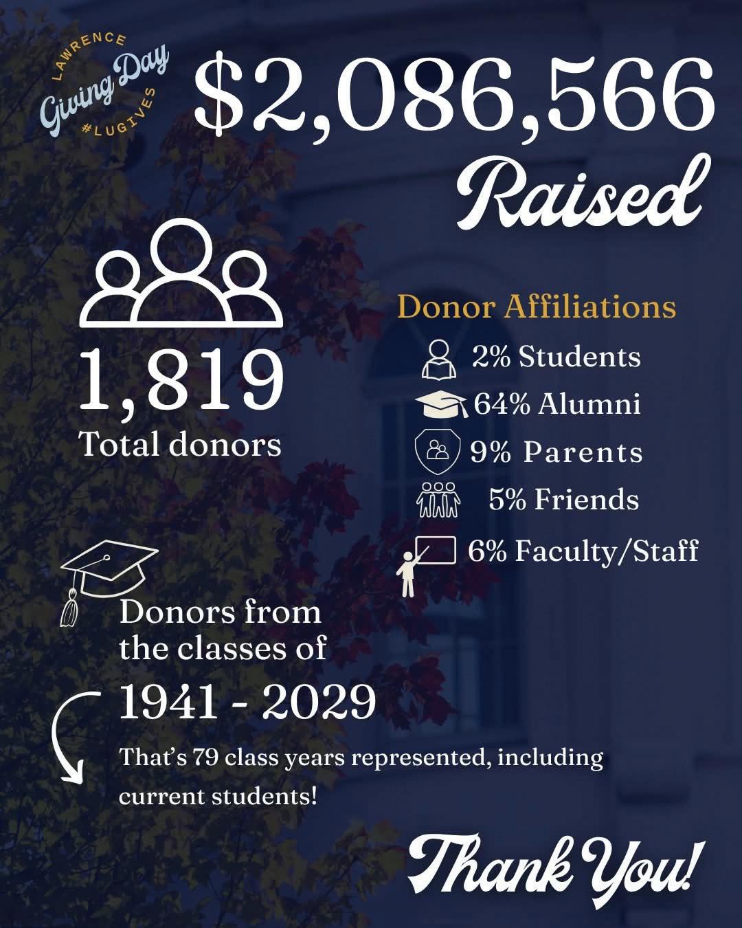 Thank you for your ongoing support and encouragement of Lawrence University. We have much to celebrate and many more to come. Working together, We the Lawrentians, will continue to explore, innovate, and inspire in everything we do.
