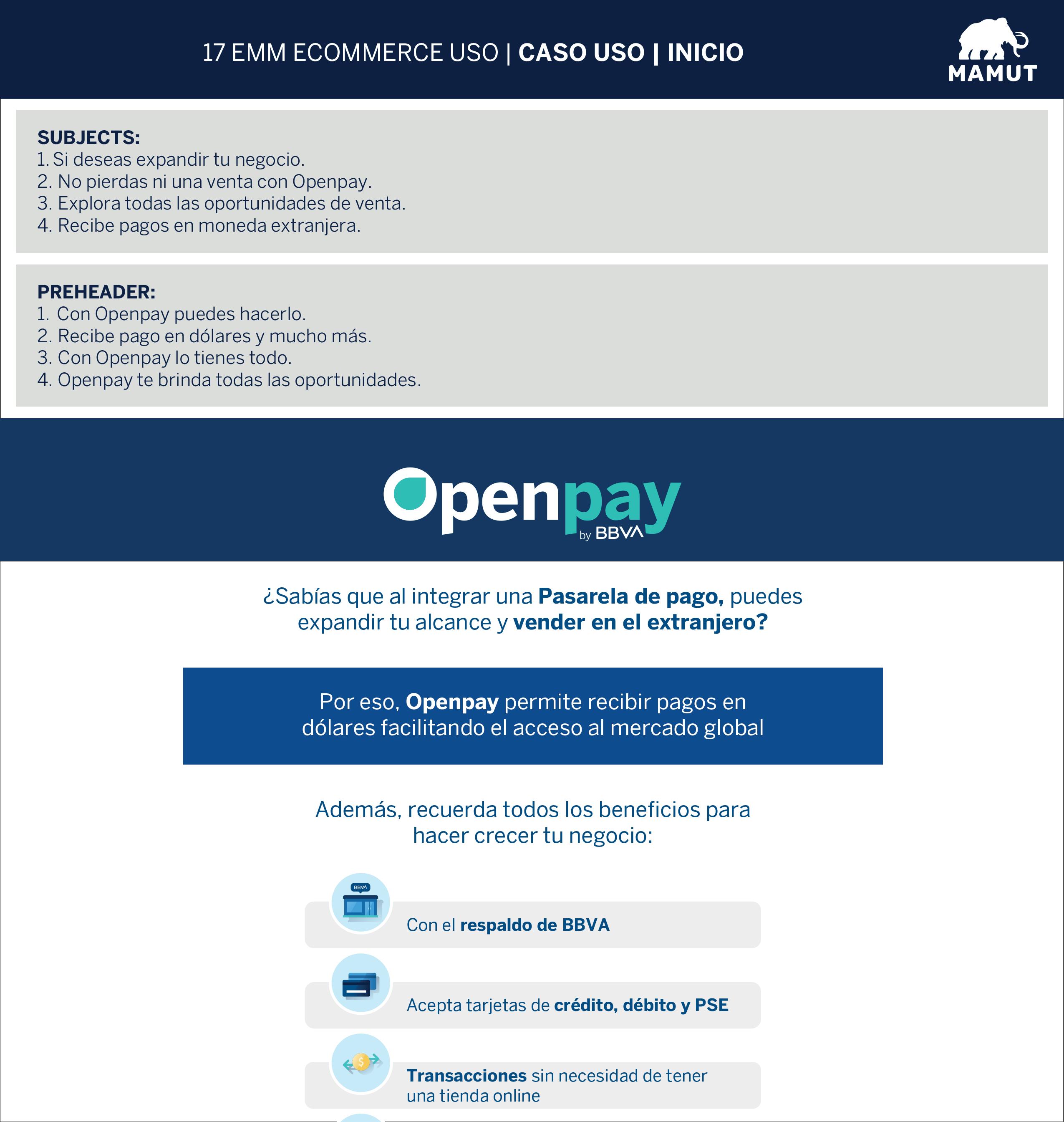Crear campañas de correo con un copy de alta conversión, diseñado para comunicar los beneficios de Usar Openpay con Pasarela de pago.