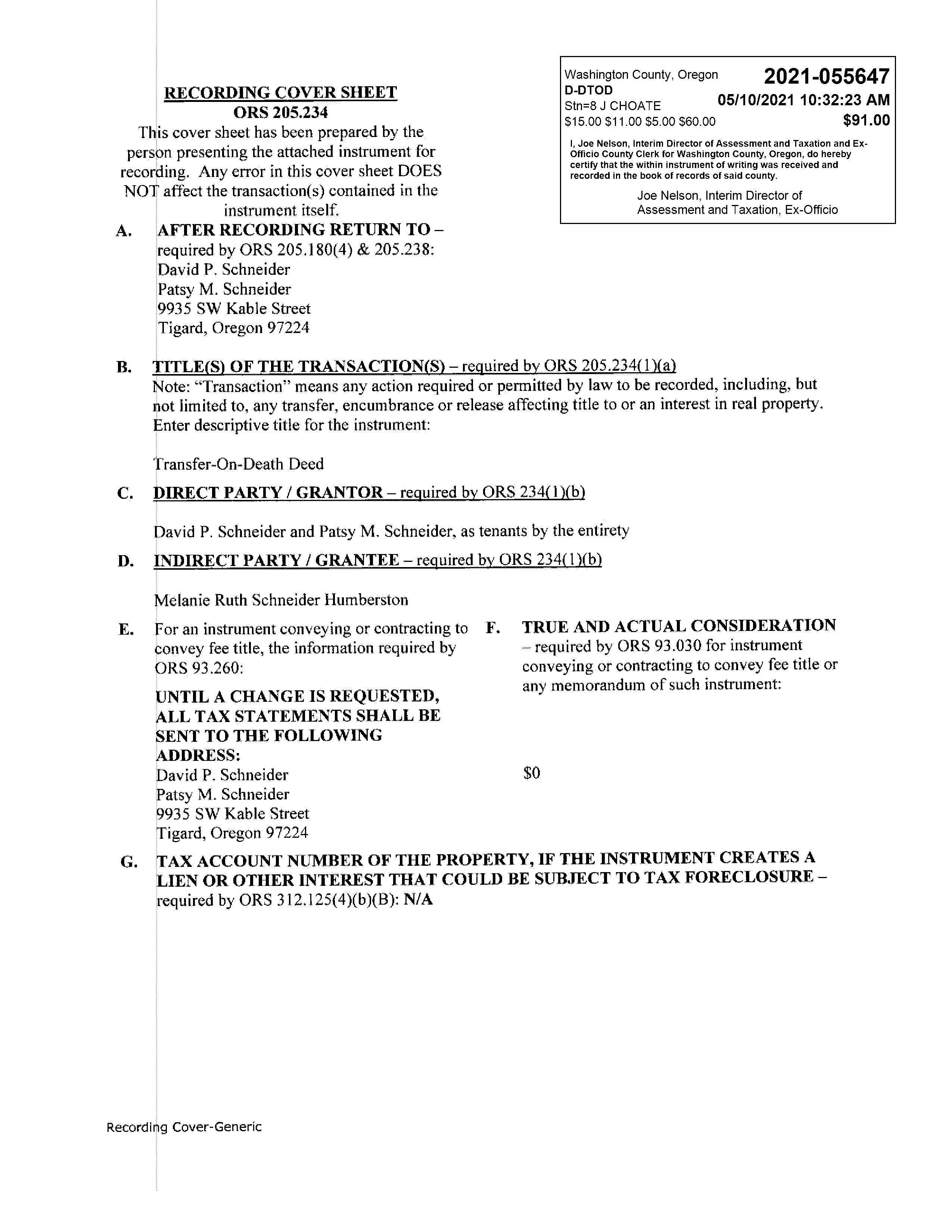Mail Address: 9935 SW Kable St, Tigard OR 97224 *Owner Occupied