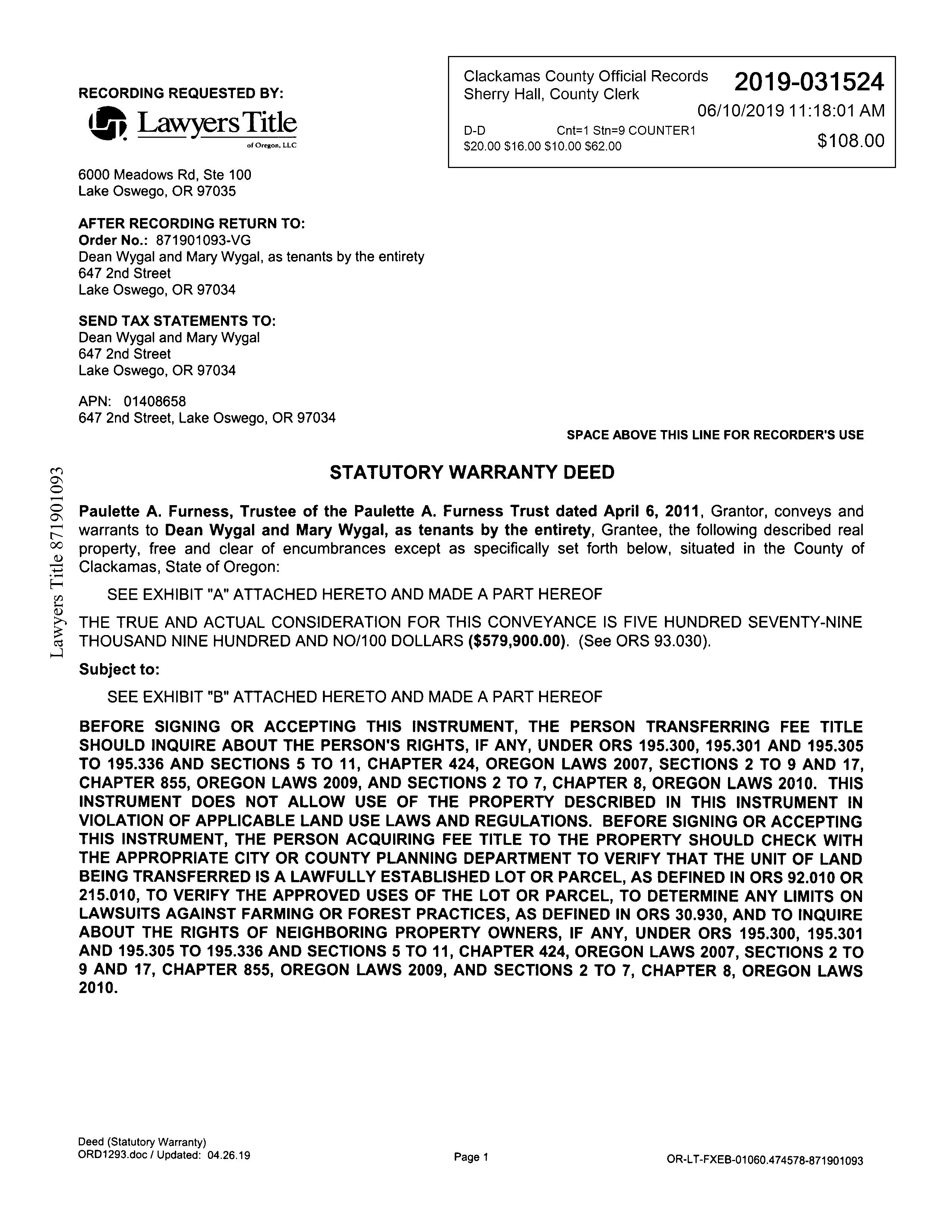 Subject Property Location Report Date: 03/31/2023 Property Address 647 2ND ST Order ID: R111374082 City, State & Zip LAKE OSWEGO, OR 97034-2341 County CLACKAMAS COUNTY Property Use Single Family Residential Mailing Address 647 2ND ST, LAKE OSWEGO, OR 97034-2341 Parcel Number 21E03DA08002 Subject Property Address 647 2ND ST, LAKE OSWEGO, OR 97034 APN 21E03DA08002 Owner WYGAL DEAN & MARY Lot Size (SF/AC) Bedrooms 2 Year Built 1991 Living Area (SF) 1,457 Bathrooms/Partial 2 Garage/No. of Cars Garage/1 Phones (503) 819-8940 Nearby Neighbor #1 Address 655 2ND ST, LAKE OSWEGO, OR 97034 APN 21E03DA08001 Owner CAMPAGNA BRIAN & KRISTINA Lot Size (SF/AC) Bedrooms 2 Year Built 1991 Living Area (SF) 1,457 Bathrooms/Partial 2 Garage/No. of Cars Garage/1 Phones Nearby Neighbor #2 Address 643 2ND ST, LAKE OSWEGO, OR 97034 APN 21E03DA08000 Owner SALING HARRY K; SALING SHARI M Lot Size (SF/AC) Bedrooms 2 Year Built 1991 Living Area (SF) 1,457 Bathrooms/Partial 2 Garage/No. of Cars Garage/1 Phones Nearby Neighbor #3 Address 639 2ND ST, LAKE OSWEGO, OR 97034 APN 21E03DA08100 Owner SCHLESINGER MAX D Lot Size (SF/AC) Bedrooms 2 Year Built 1991 Living Area (SF) 1,457 Bathrooms/Partial 2/1 Garage/No. of Cars Garage/1 Phones Nearby Neighbor #4 Address 184 D AVE, LAKE OSWEGO, OR 97034 APN 21E03DA10800 Owner BIZZANO CHRISTOPHER Lot Size (SF/AC) Bedrooms 2 Year Built 1987 Living Area (SF) 1,636 Bathrooms/Partial 2/1 Garage/No. of Cars Garage/1 Phones Nearby Neighbor #5 Address 182 D AVE, LAKE OSWEGO, OR 97034 APN 21E03DA10700 Owner AMANN GRETCHEN Lot Size (SF/AC) Bedrooms 2 Year Built 1987 Living Area (SF) 1,636 Bathrooms/Partial 2/1 Garage/No. of Cars Garage/1 Phones Nearby Neighbor #6 Address 186 D AVE, LAKE OSWEGO, OR 97034 APN 21E03DA10900 Owner ZAANDER MEGAN Lot Size (SF/AC) Bedrooms 2 Year Built 1987 Living Area (SF) 1,636 Bathrooms/Partial 2/1 Garage/No. of Cars Garage/1 Phones