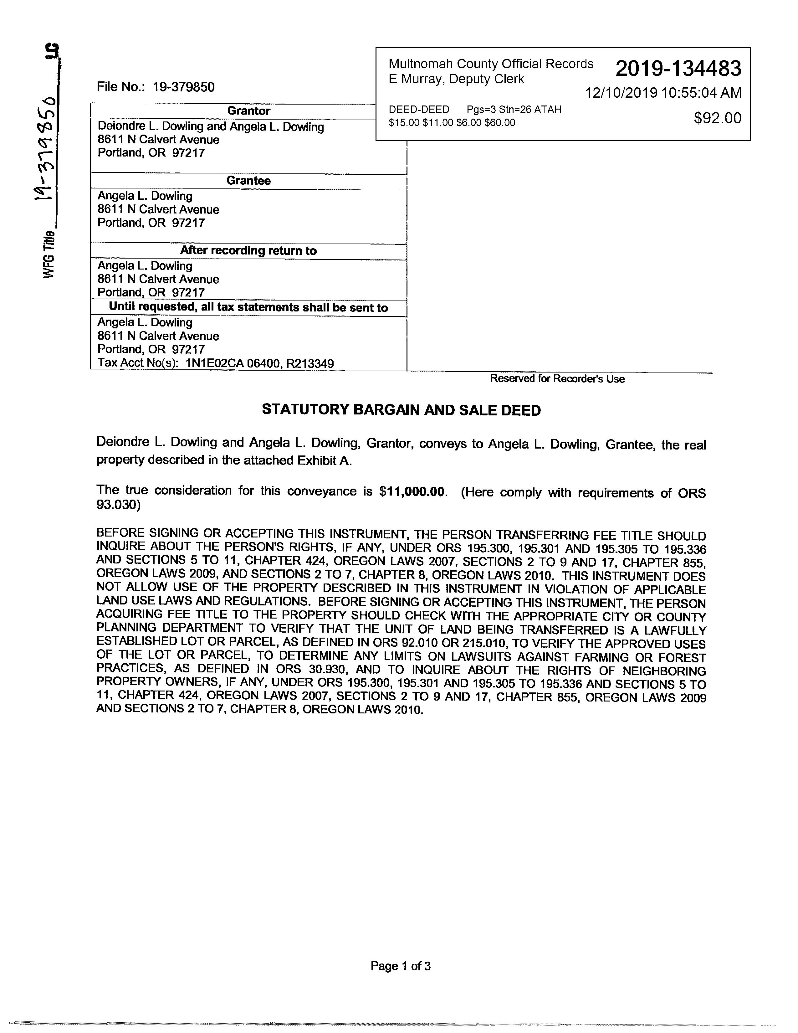 Owner:Dowling,Angela L 8611 N CalvertAve Portland OR 97217 - 7081