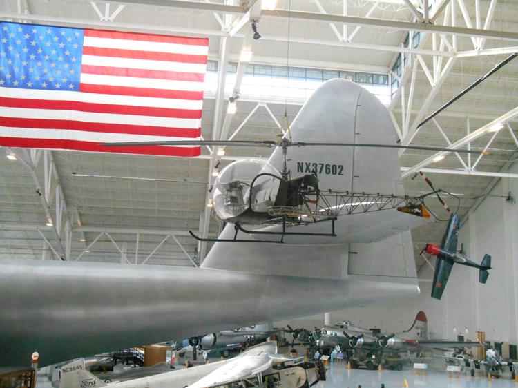 Displaying a number of military and civilian aircraft and spacecraft, most notably, the Hughes H-4 Hercules, popularly known as the Spruce Goose.