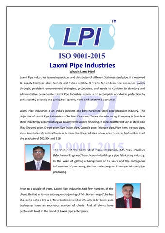 Laxmi Pipe Industries What is Laxmi Pipe? Laxmi Pipe Industries is a main producer and distributor of different Stainless steel pipe. It is resolved to supply Stainless steel funnels and Tubes reliably. It works for endeavoring consumer loyalty through, persistent enhancement strategies, procedures, and assets to conform to statutory and administrative prerequisite. Laxmi Pipe Industries vision is, to accomplish worldwide perfection by consistent by creating and giving best Quality items and satisfy the Costumer.