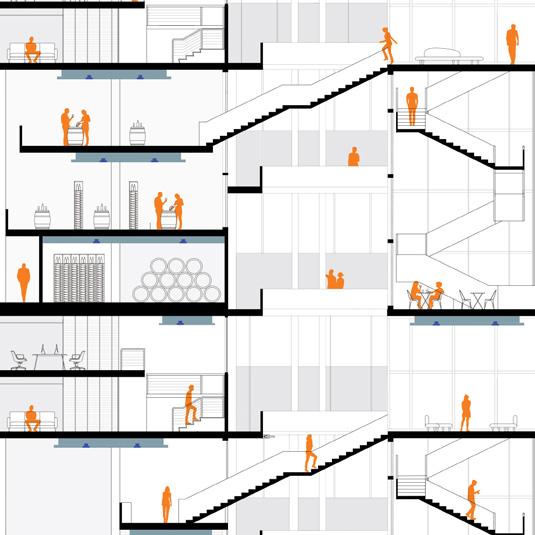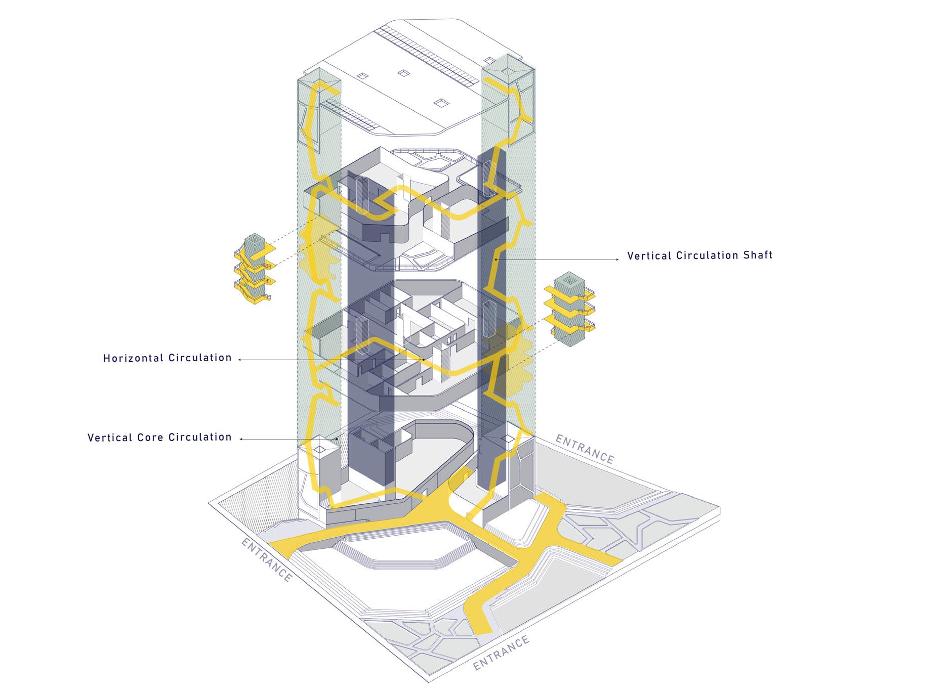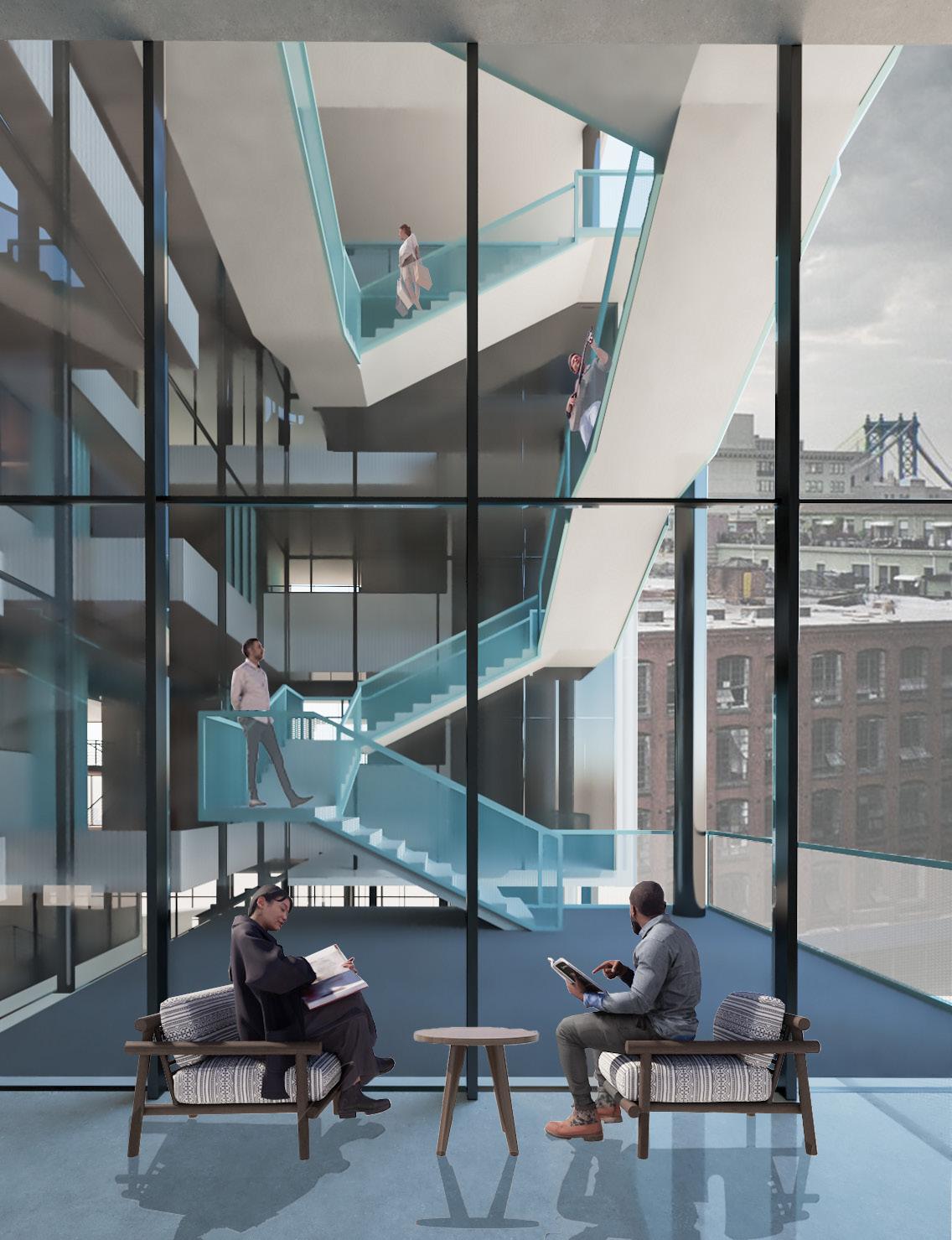 We envision the journey as part of the destination. The staircase begins on the ground floor, spiraling around to the outdoor atrium, ascending outdoor stairs, then re-entering the building to continue its intertwining path. This design transforms the atrium into an engaging thoroughfare, filled with activities and scenic views.