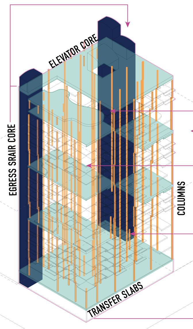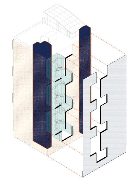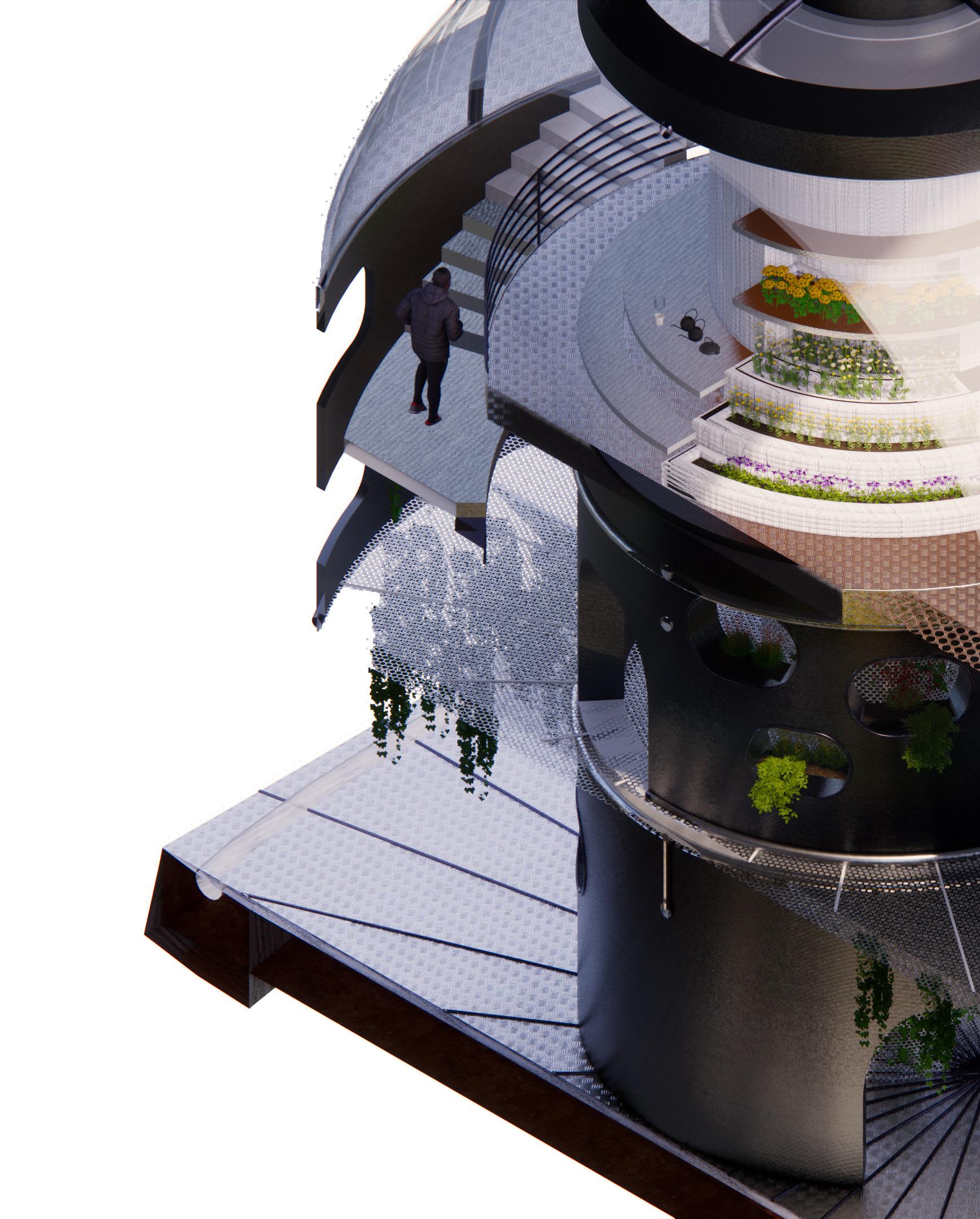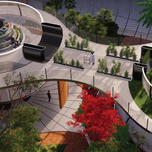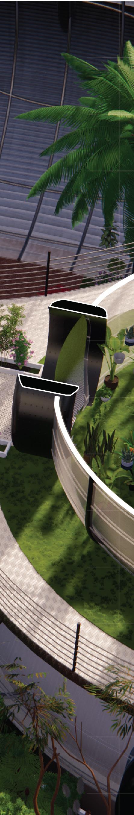 We envision the journey as part of the destination. The staircase begins on the ground floor, spiraling around to the outdoor atrium, ascending outdoor stairs, then re-entering the building to continue its intertwining path. This design transforms the atrium into an engaging thoroughfare, filled with activities and scenic views.