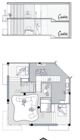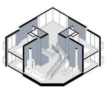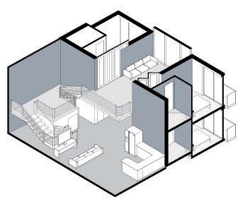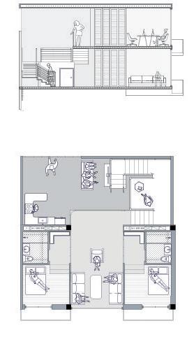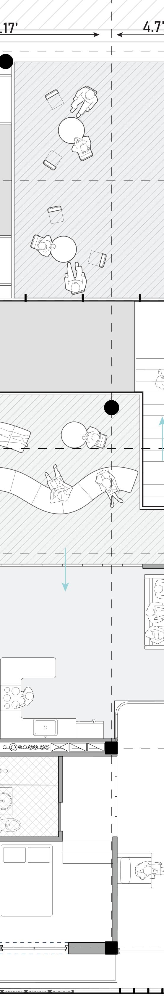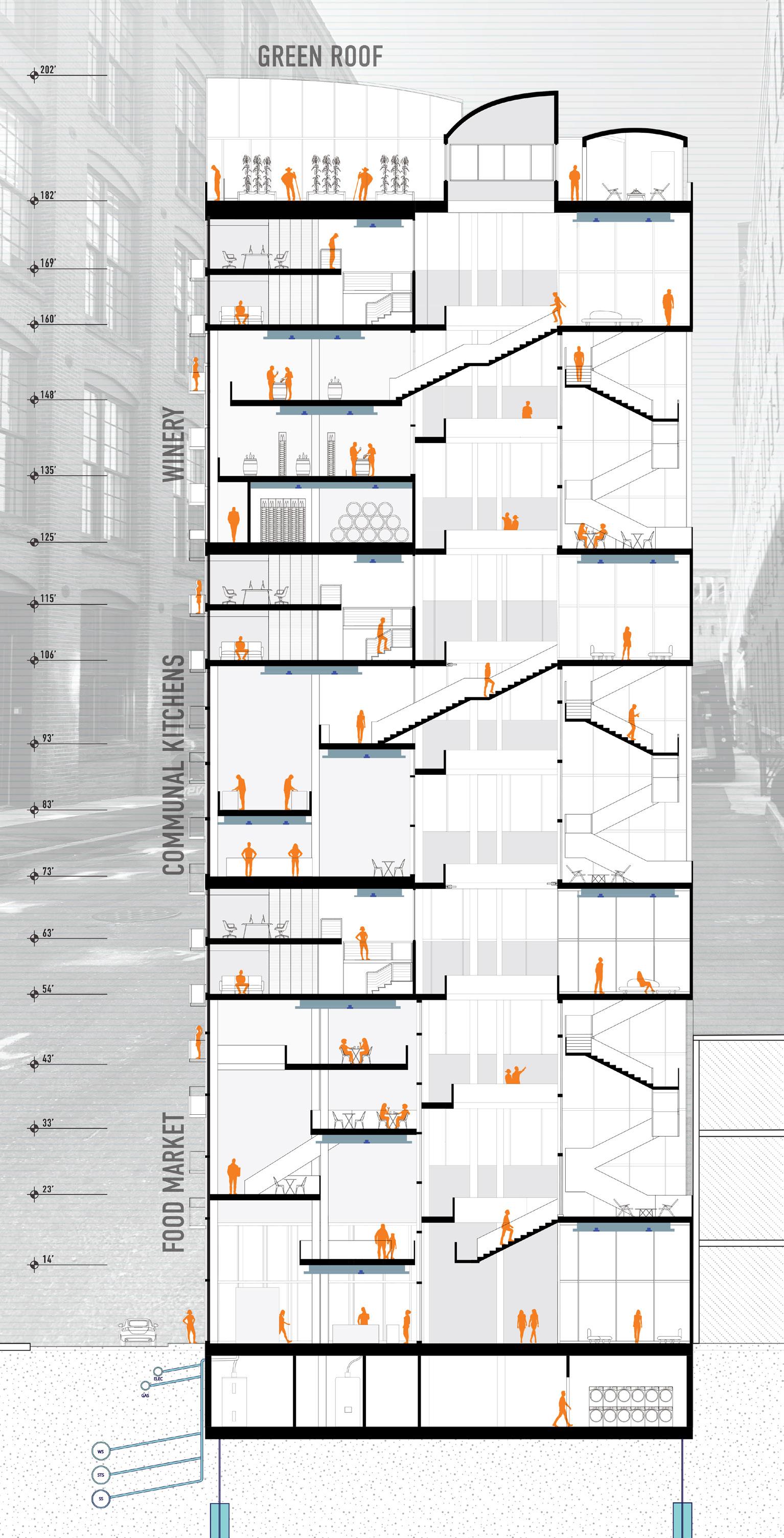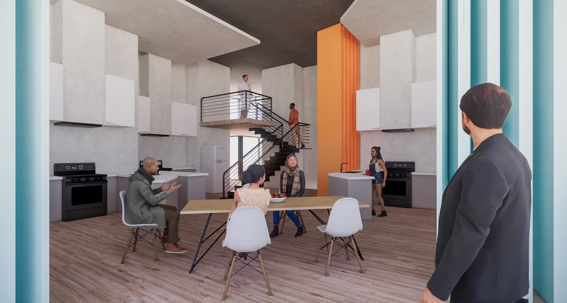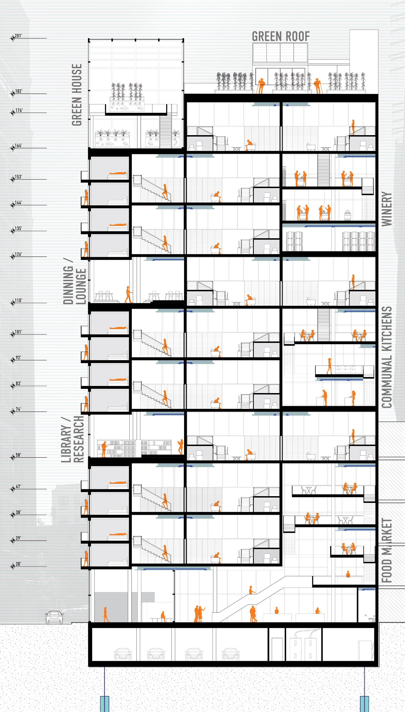 Located in Brooklyn’s Vinegar Hill, this co-housing project is designed specifically for individuals in the culinary industry. The goal is to foster connections among residents by merging and intertwining spaces and circulation while respecting individual privacy. Each “cell,” or bedroom, offers the option to connect to adjacent workspaces or living areas through folding walls. This flexibility encourages collaboration and reinforces the idea that food brings people together, allowing kitchen spaces to blend with neighbors.