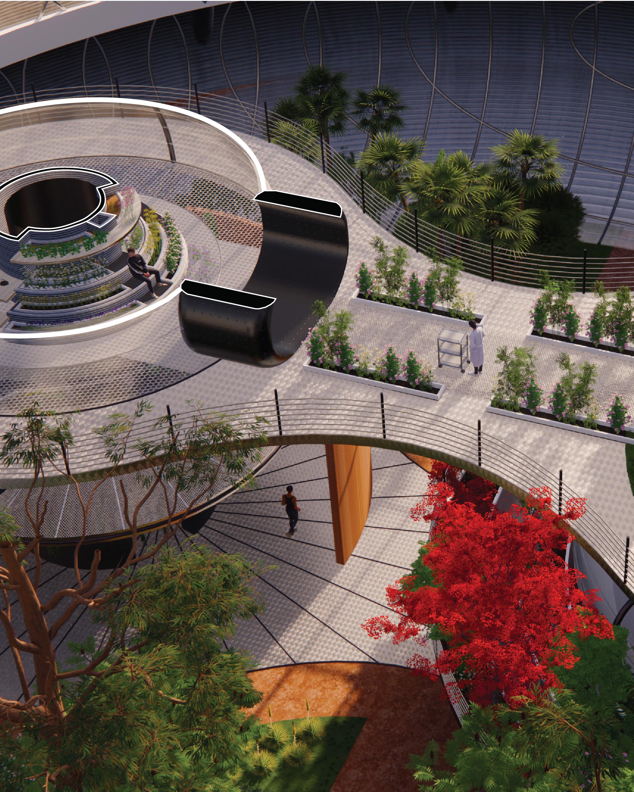 At the core of this initiative is the question: how can the development of a medicinal botanical garden enhance human performance on Mars? Our response involves creating three simulated environments that represent different ecosystems beneficial for the mental and physical health of the scientists on site, providing both preventive and curative treatments for radiation-related ailments, as well as immersive isolation experiences. Each ecosystem features an integrated medicinal wing tailored to address specific stages of radiation exposure illnesses: preventive, curative, and, in worst-case scenarios, a hospice-like isolated environment. This design aims to foster a sense of belonging in the harsh landscape of a foreign planet.