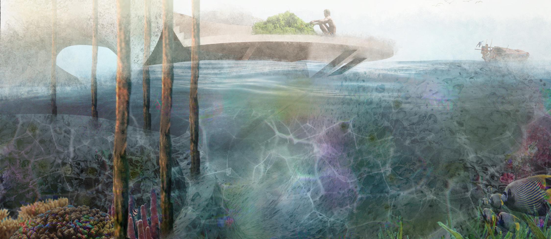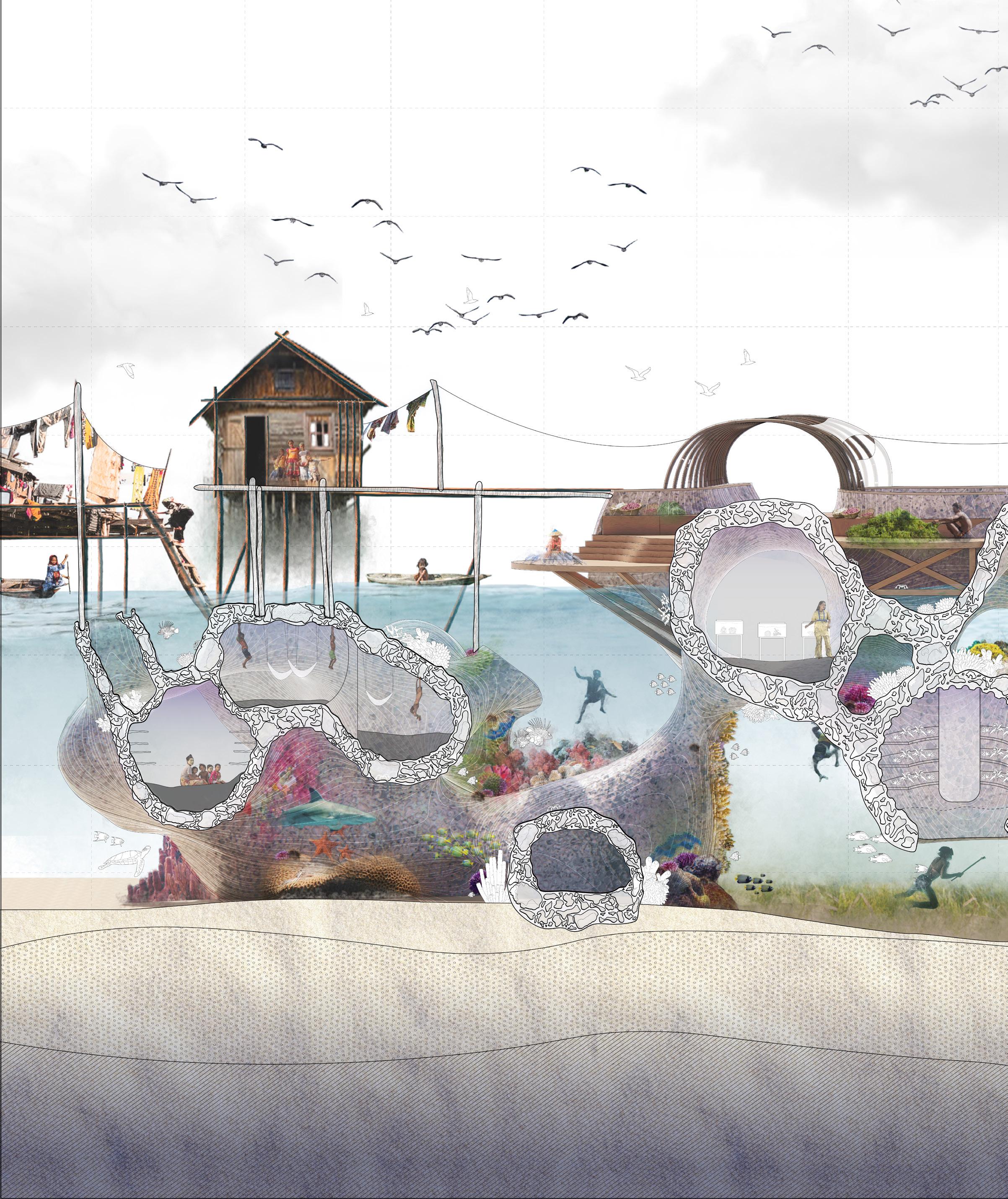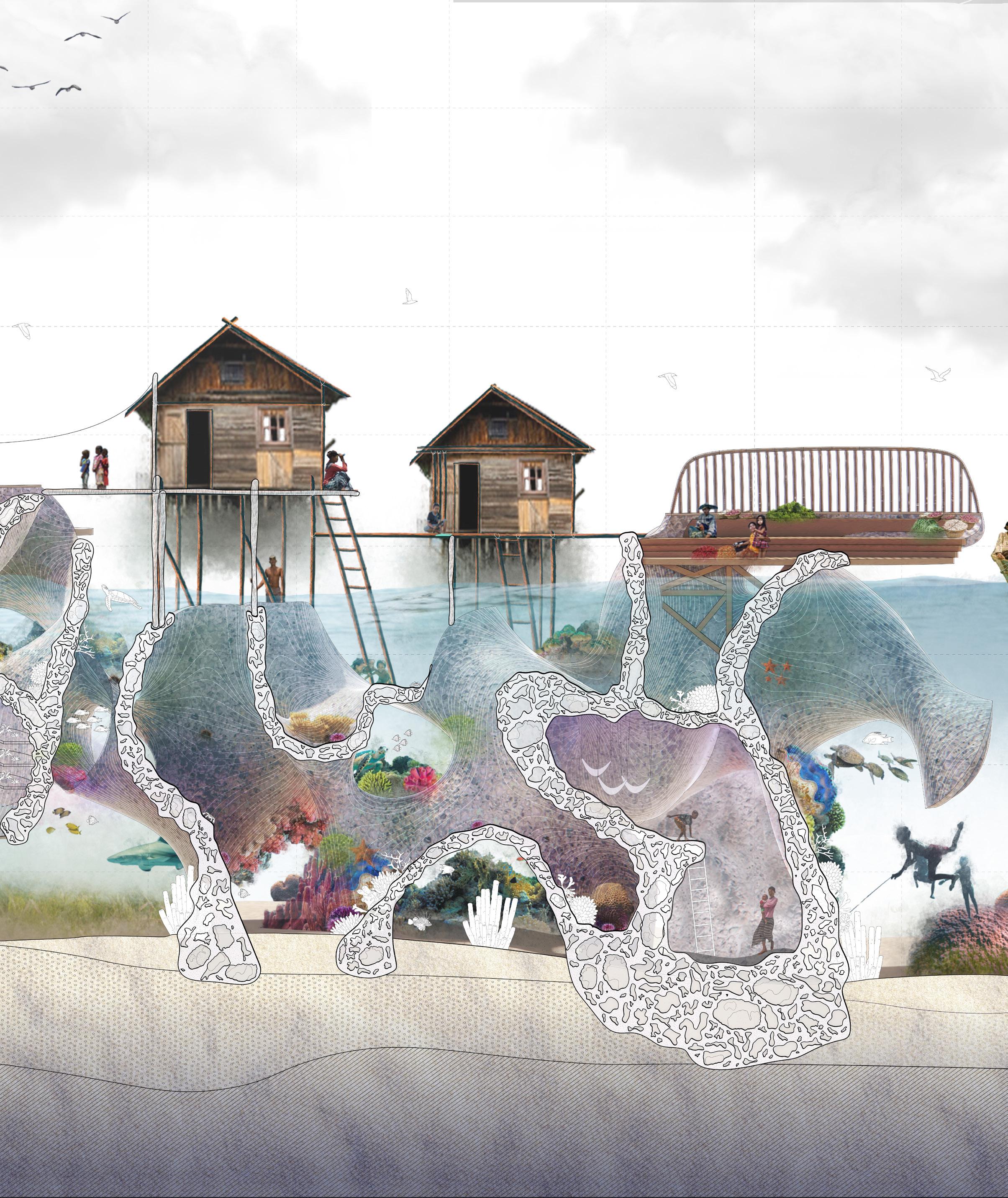 By understanding the life cycle of corals and the formation of coral reefs, we believe architectural interventions can help improve the living conditions of communities directly affected by coral loss. We propose a modular additive system designed to facilitate reef restoration, integrating architectural programs such as underwater farming, emergency shelters, and trading markets for local production.