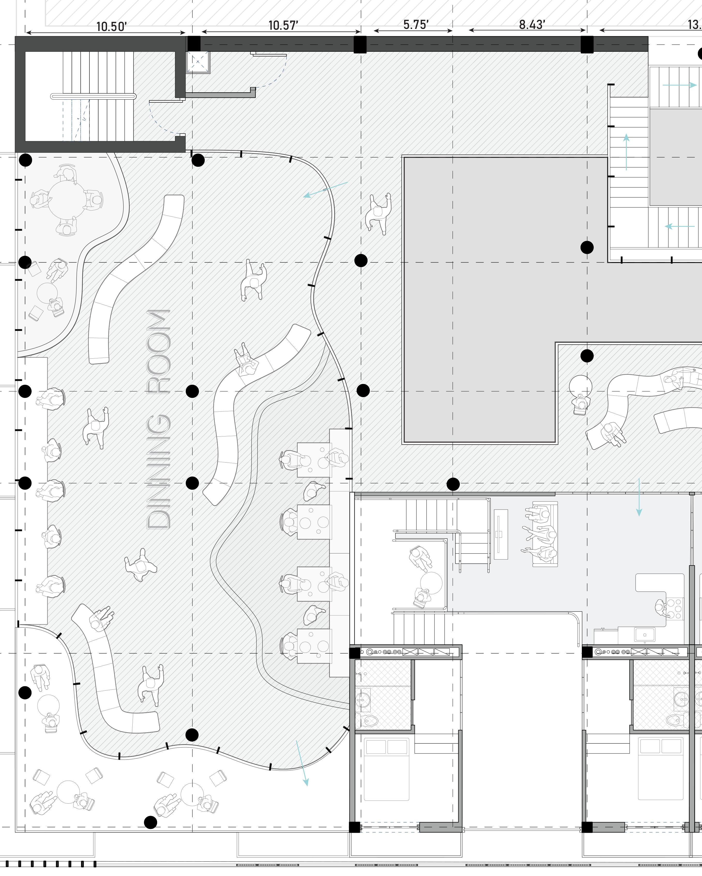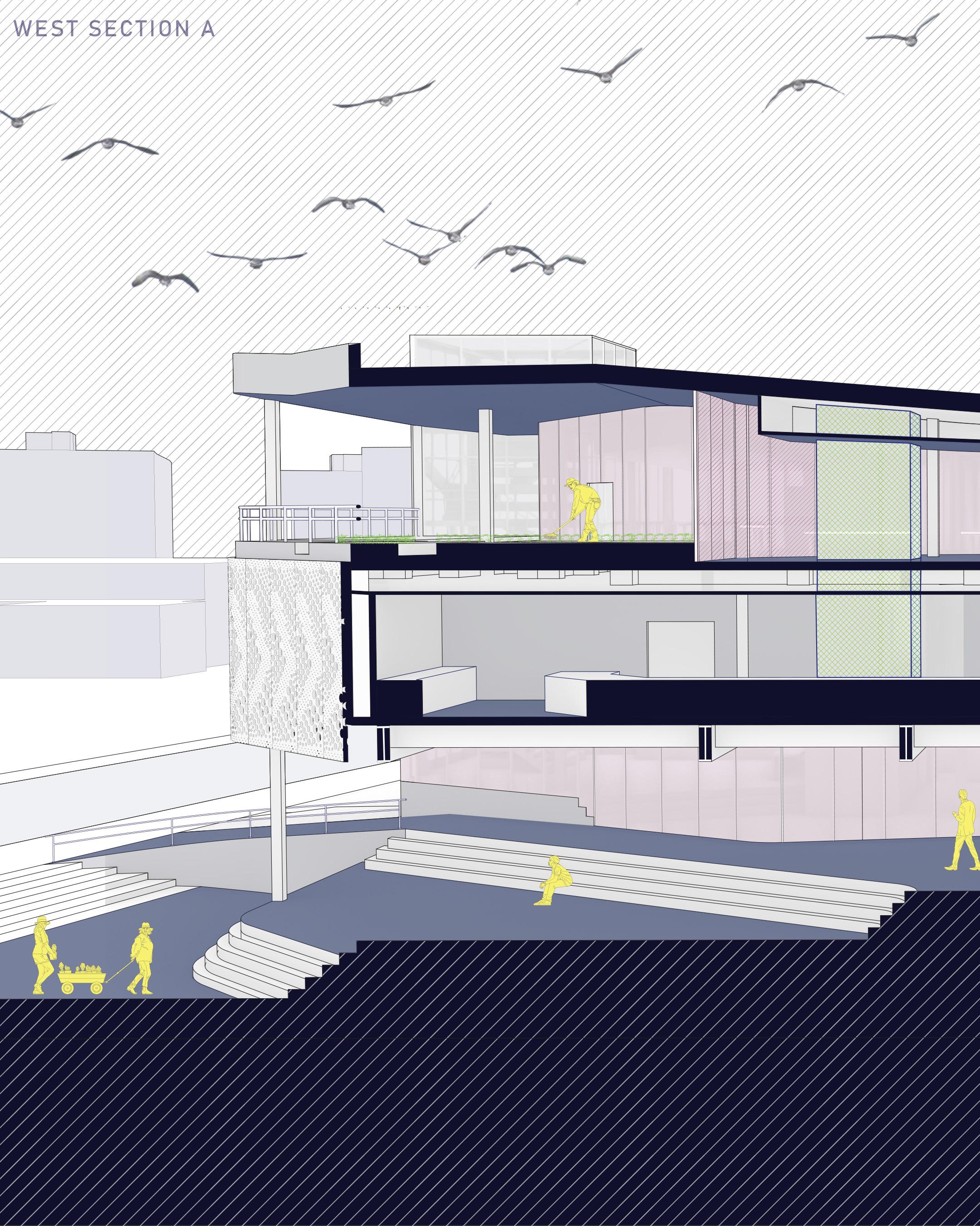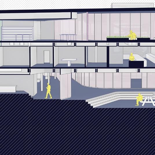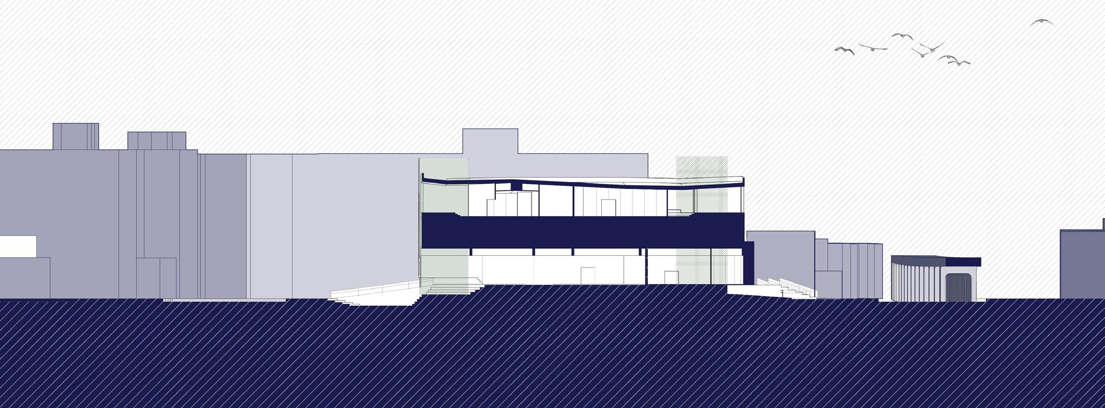 The first floor is designed as a sacrificial space, acknowledging the site’s floodplain. The landscape is tailored to align with the area’s flooding patterns, while the building is elevated slightly above street level. In times of emergency, the structure transitions into a shelter; metal panels on the second floor can be shifted to the third floor to fully enclose the outdoor areas, providing safety and security.