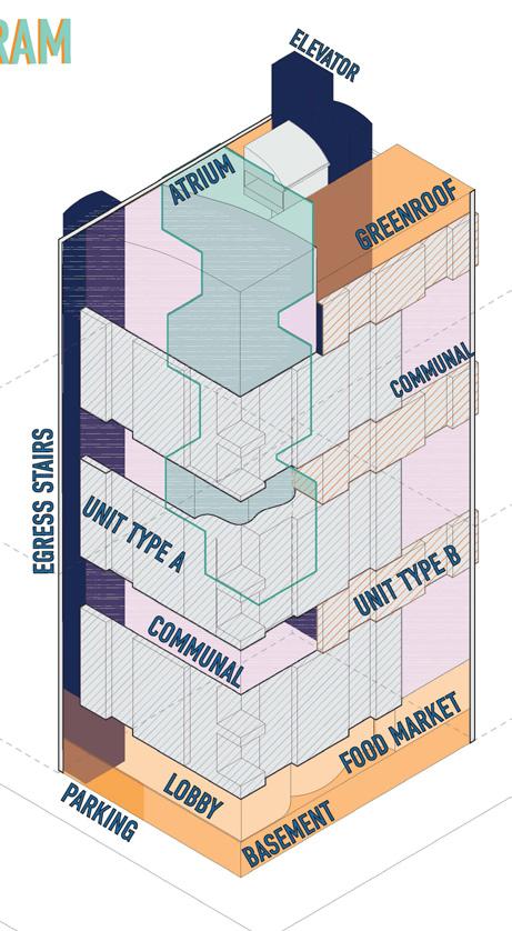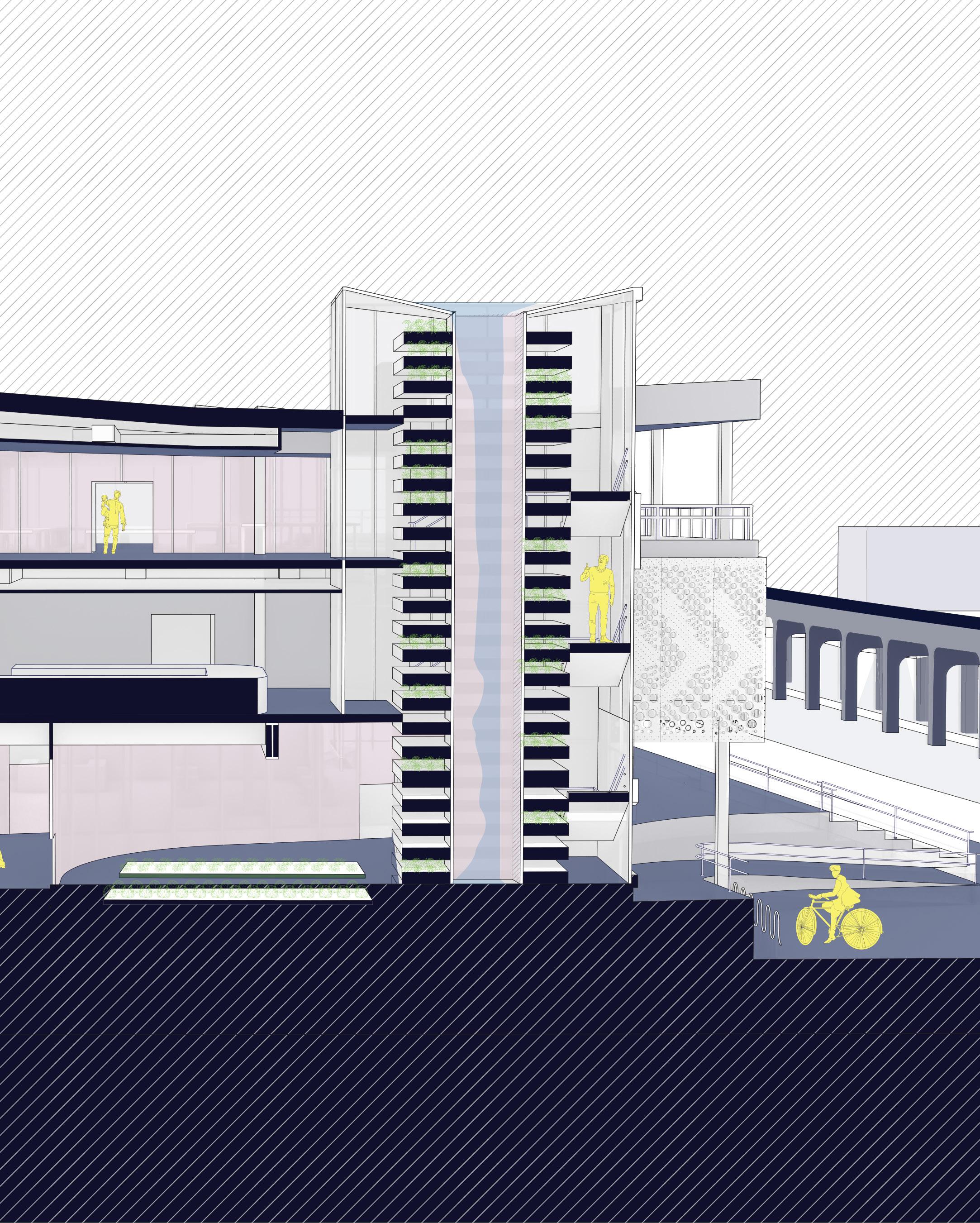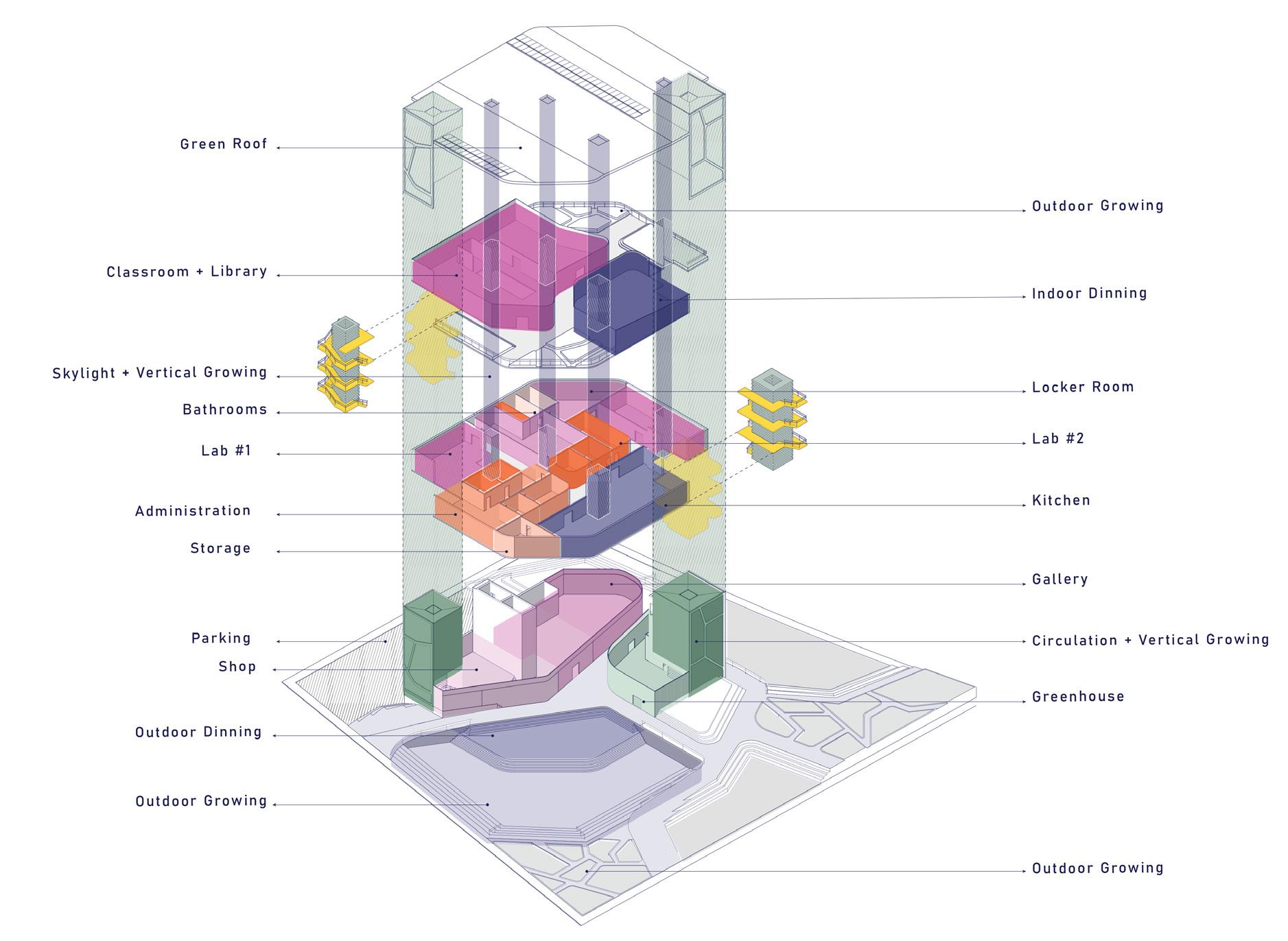 Located in Far Rockaway, this community center-turned-emergency shelter emphasizes the integration of agriculture and resilience, fostering community engagement. The core focus of this project is farming, serving as a catalyst to encourage occupants to actively participate in improving their neighborhood. Farming begins on the ground floor and extends vertically through two towers, which facilitate circulation while creating an artificial environment for growing plants and vegetables. The agricultural theme continues on the third floor, maintaining the same principles of circulation and occupant experience.