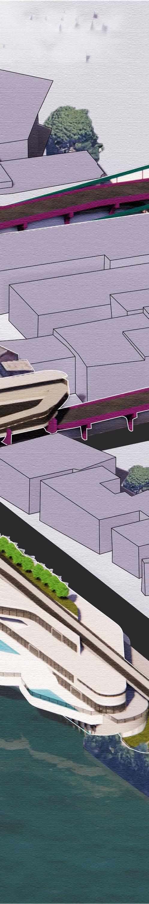 Located on the Foro Boario in Rome, Italy, “Delirium Rome” introduces an additional historical layer that prioritizes pedestrian movement through a visually immersive experience. By establishing a new ground and city edge, the project merges the primary layers of Rome—History, Manufacturing, and Tourism—into a cohesive space, connecting all elements of the forum through the introduction of new boundaries.