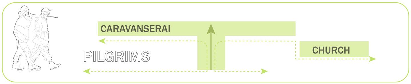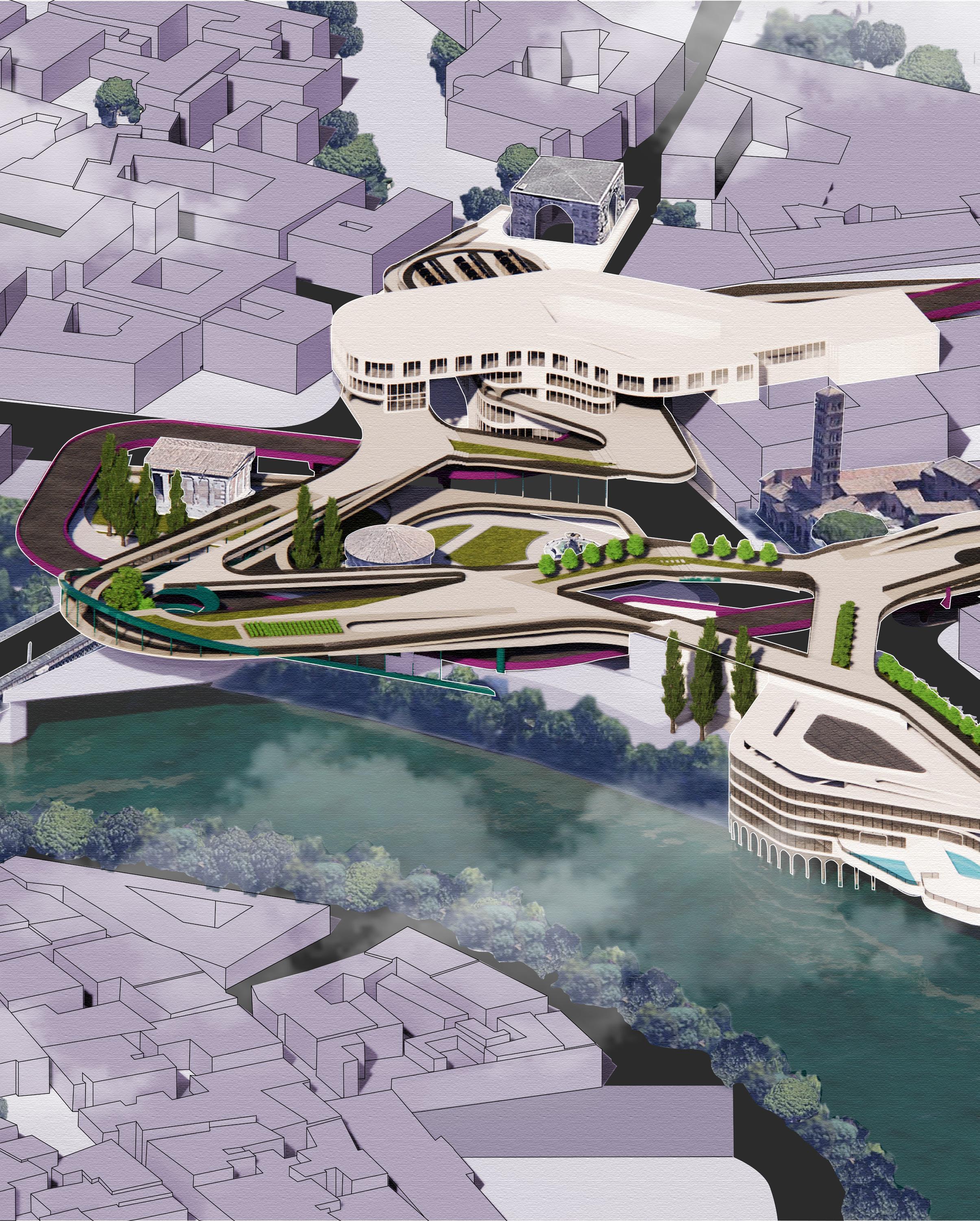 Starting from the edge of the Tiber River and extending towards the Circus Maximus and the Arch of Janus, the proposal features an elevated platform with multiple access points, facilitating continuous circulation over the highly congested site. The targeted users are categorized into three groups based on varying levels of privacy: Tourists, Locals, and Pilgrims.