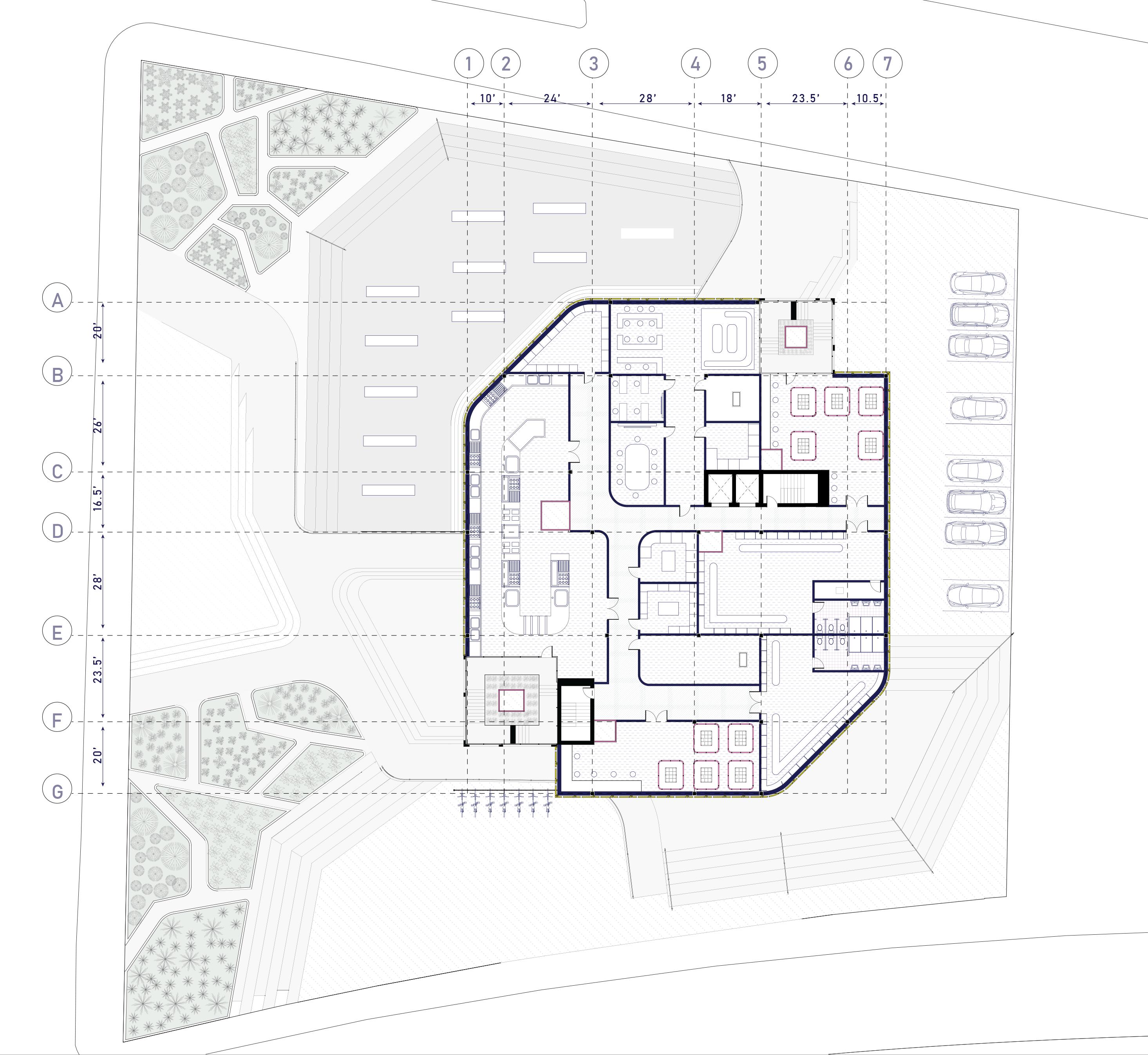 Circulation flows from the street into the building, seamlessly wrapping around internal programs and gardening spaces. Pathways from the street intersect with public gathering areas that surround an outdoor market, enhancing community interaction.